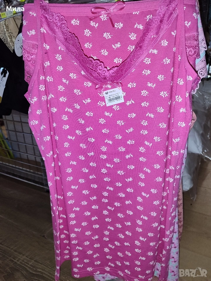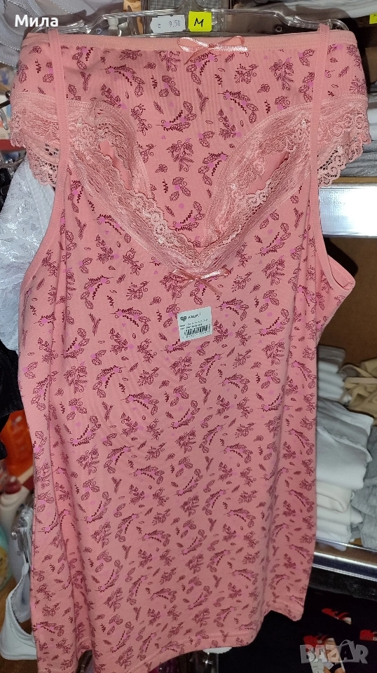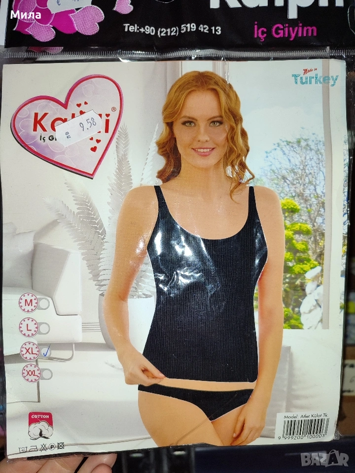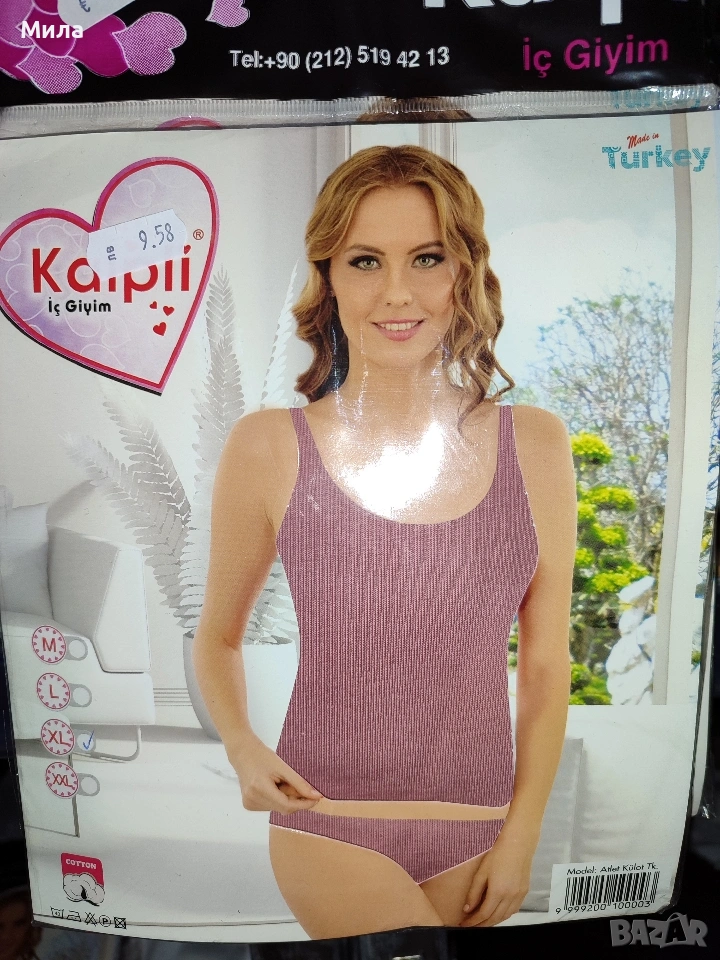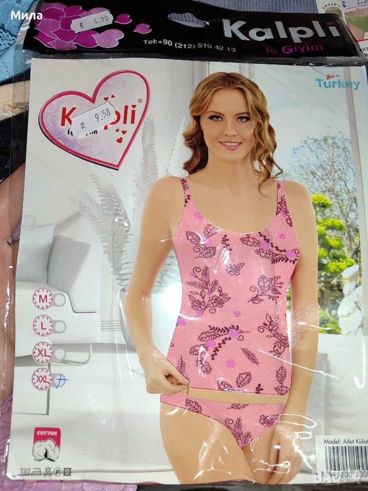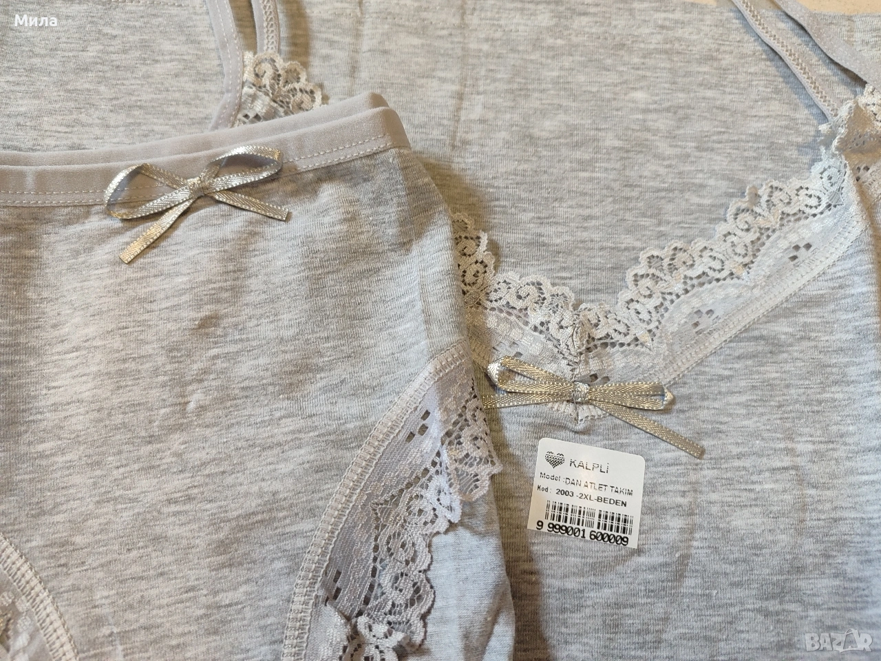 Дамски комплект бельо, корсаж с тънки презрамки и дантела на деколтето и бикини с дантела. Гладко памучно трико, състав: 95% памук, 5 % еластан. Размери M, L, XL, 2XL