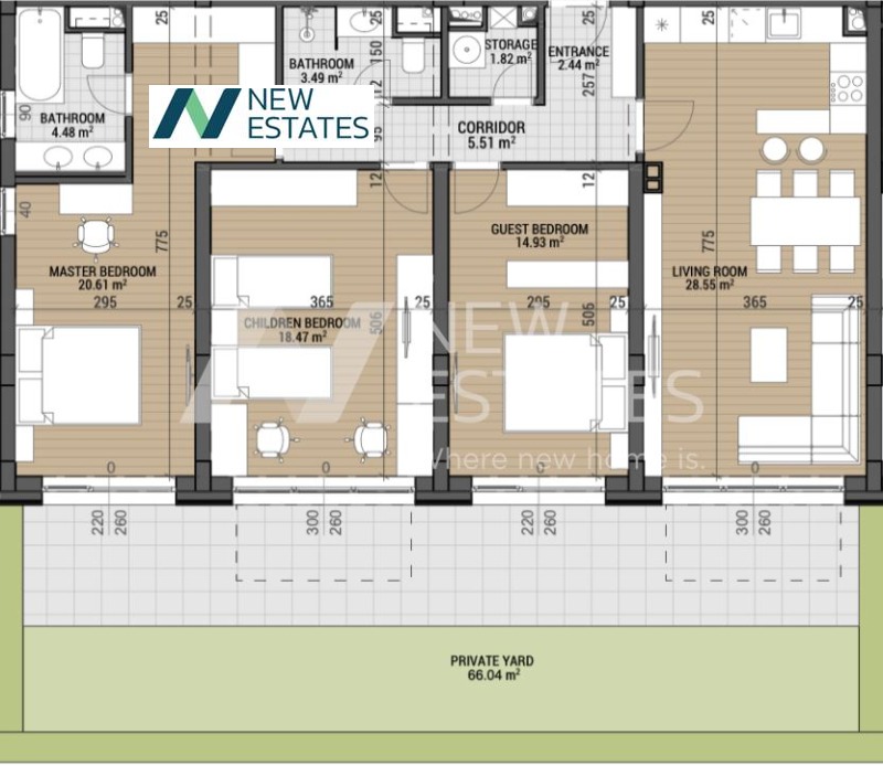 New Estates Ви представя просторен четиристаен апартамент със собствен озеленен двор, който създава усещане за живот в къща. Жилището е част от затворен комплекс, който е разположен в тиха и зелена среда, в подножието на Витоша. Дворът е естествено продължение на жилището, с директна връзка от дневната и спалните, което допринася за удобството на живущите и чувството за релакс и семейни моменти с деца и домашни любимци.