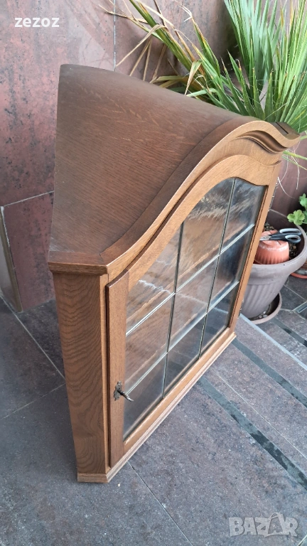 Ретро ъглова стенна витрина.Пълен масив,дъб.Оловен витраж.Добре запазана,конструктивно здрава.Размери-
