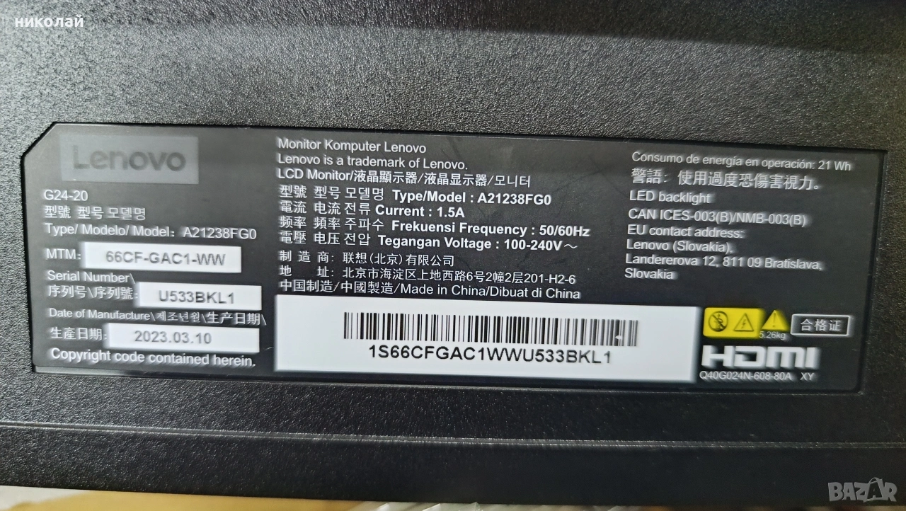 Монитор Lenovo A21238FG0 за части има шчупена матрица с HDMI входове