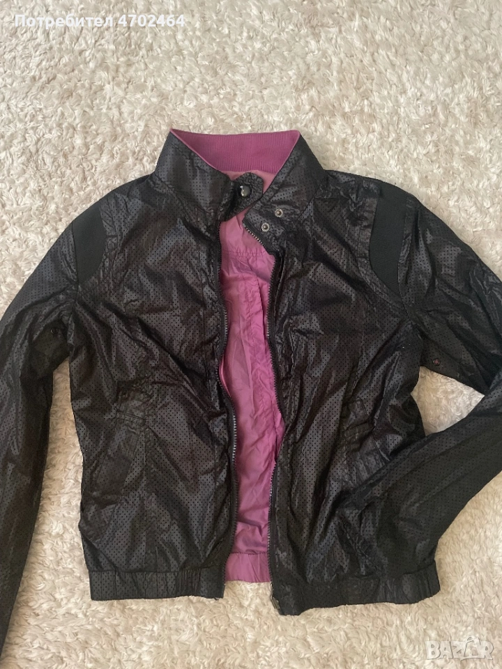 Двулицево яке (ветровка) в лилаво и черно. Използвано е веднъж, но в отлично състояние. С цип, два джоба от двете страни и ластик на ръкавите. Унисекс