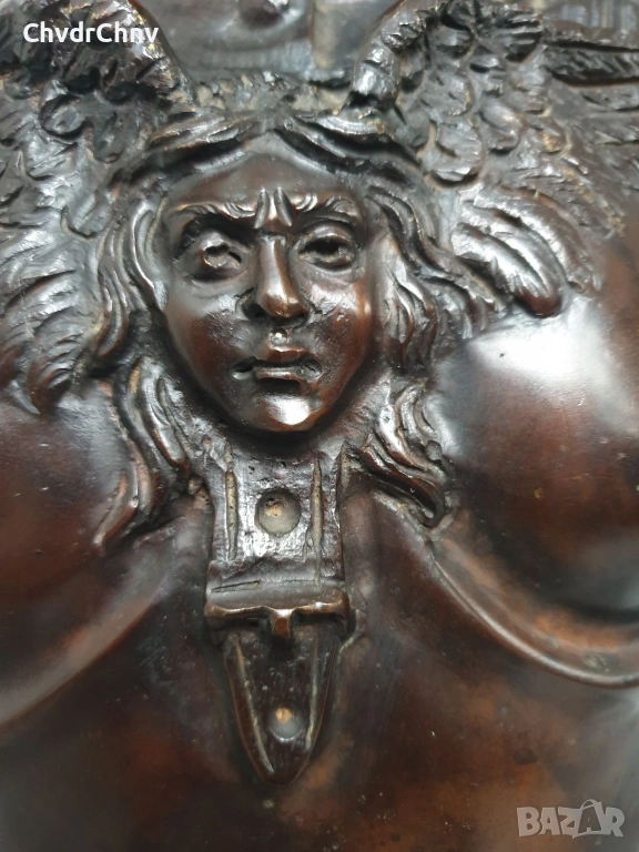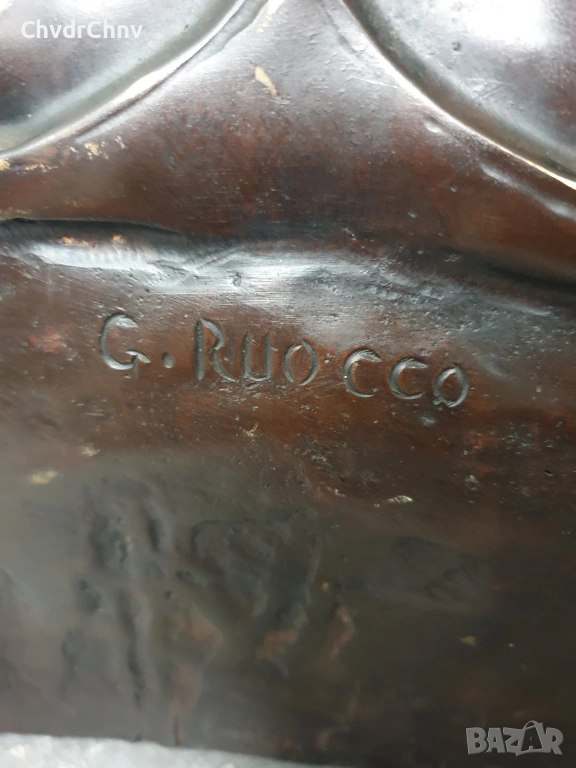 Височина 35 см (43 см е с мраморния постамент), ширина 32 см, дълбочина 17 см, тежи около 14 кг, стар бронз, детайлна, запазена, подписана G. Ruocco.