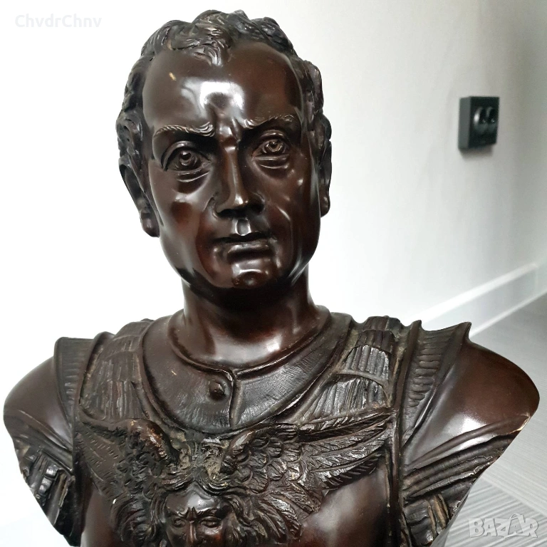 Скулптурата е точно копие (от средата на 20-ти век, 1960/1970-те) на бюст на средновековен венециански военачалник (Erasmo Stefano da Narni, 1370-1443, известен като Gattamelata). Оригиналът е на Donatello (1386-1466), и генералът е на кон. Статуята на Донатело е направена през 1453 г, и се намира в Падуа Италия (Piazza del Santo).