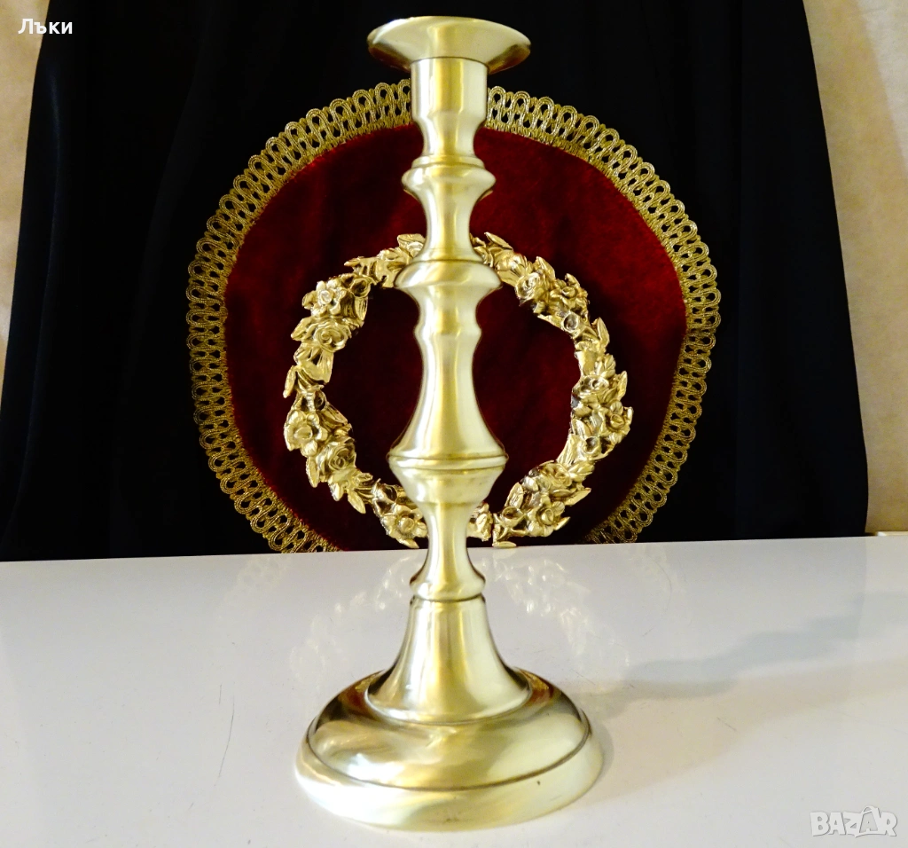 бронз със златен блясък.Декориран с ефектен релеф,издържан в стил Art Deco.Вечен свещник –