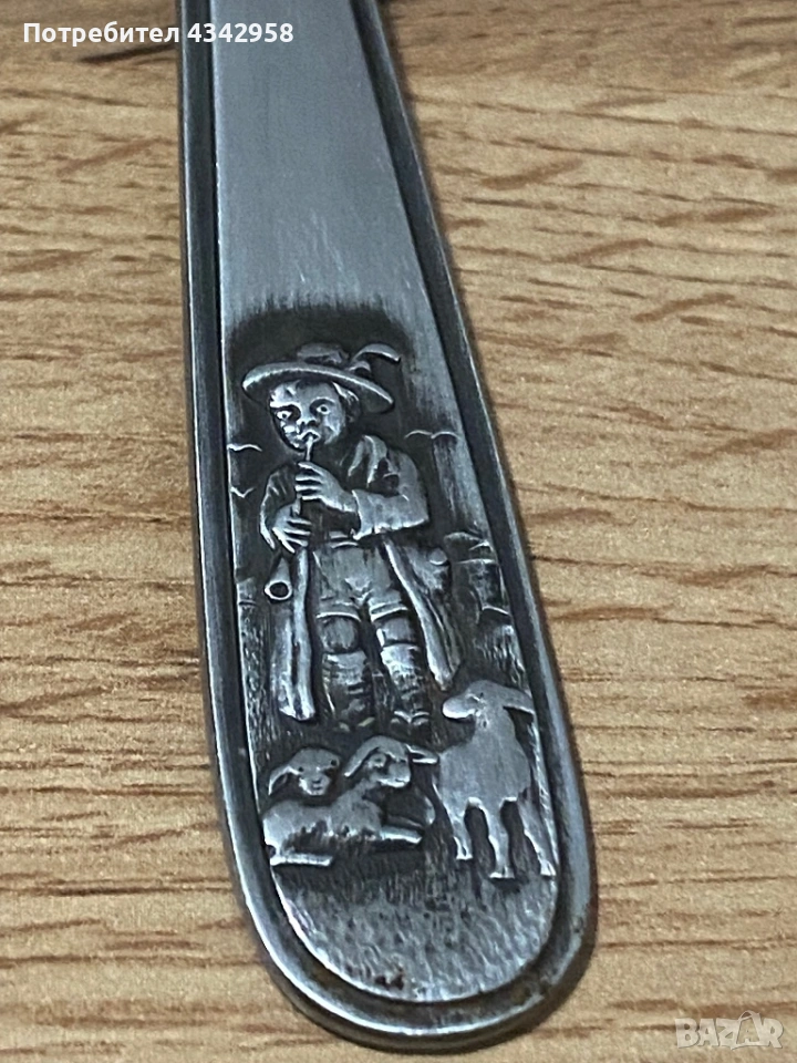 Винтидж детски столов нож с релефна украса – дете пастир с животни.