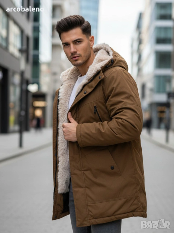 Това практично мъжко яке тип парка с мека, изолирана вътрешност е идеално за студените дни. Оборудвано с функционални джобове и регулируема качулка с кожена подплата, то осигурява отлична защита срещу студа, като същевременно запазва стилен външен вид благодарение на класическата си кройка.