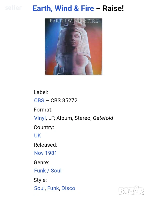 Earth, Wind & Fire ‎– Raise! Издание uk 🇬🇧 1981г-GATEFOLD Стил: Funk / Soul Състояние на винила:ед → Обява 53036880