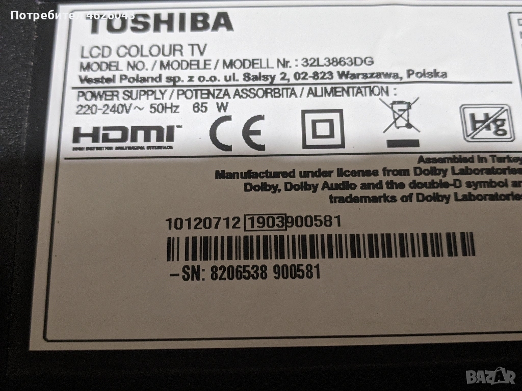 TOSHIBA 32L3863DG-17MB211S-17IPS62-HV320FHB-N00 47-6021051 → Обява 53036931