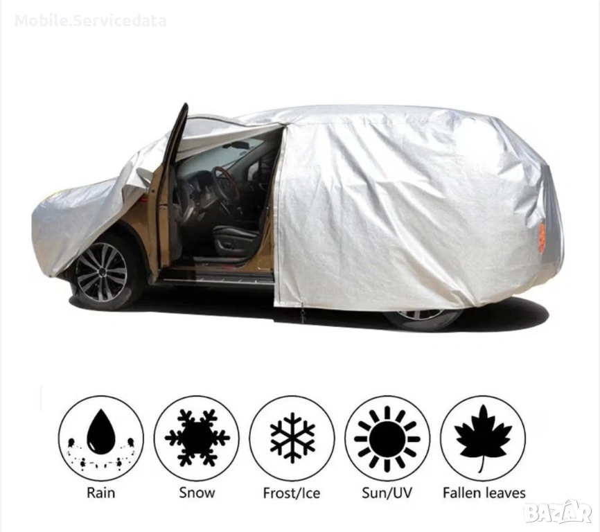 брезент) – универсален размер L (около 4.7 m x 1.8 m x 1.5 m), подходящо за повечето автомобили седан/hatchback/комби.