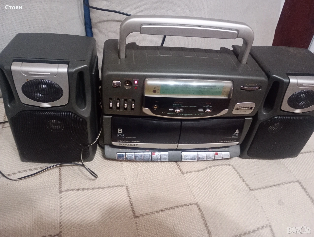 свири добре на радио. На касета звука е по- слаб и леко провлачен. Едната колонка не може да се закачи.