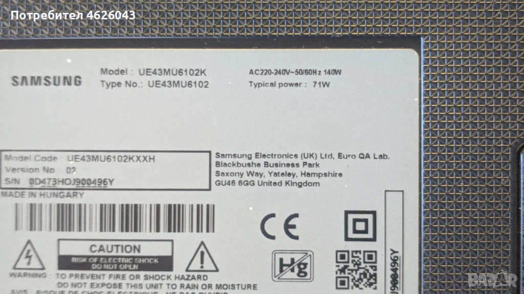 SAMSUNG UE43MU6102-BN41-02568B-BN44-00806A → Обява 53037538