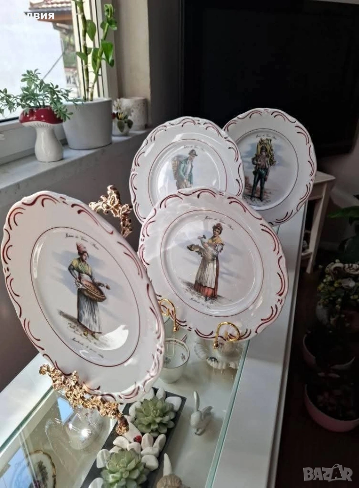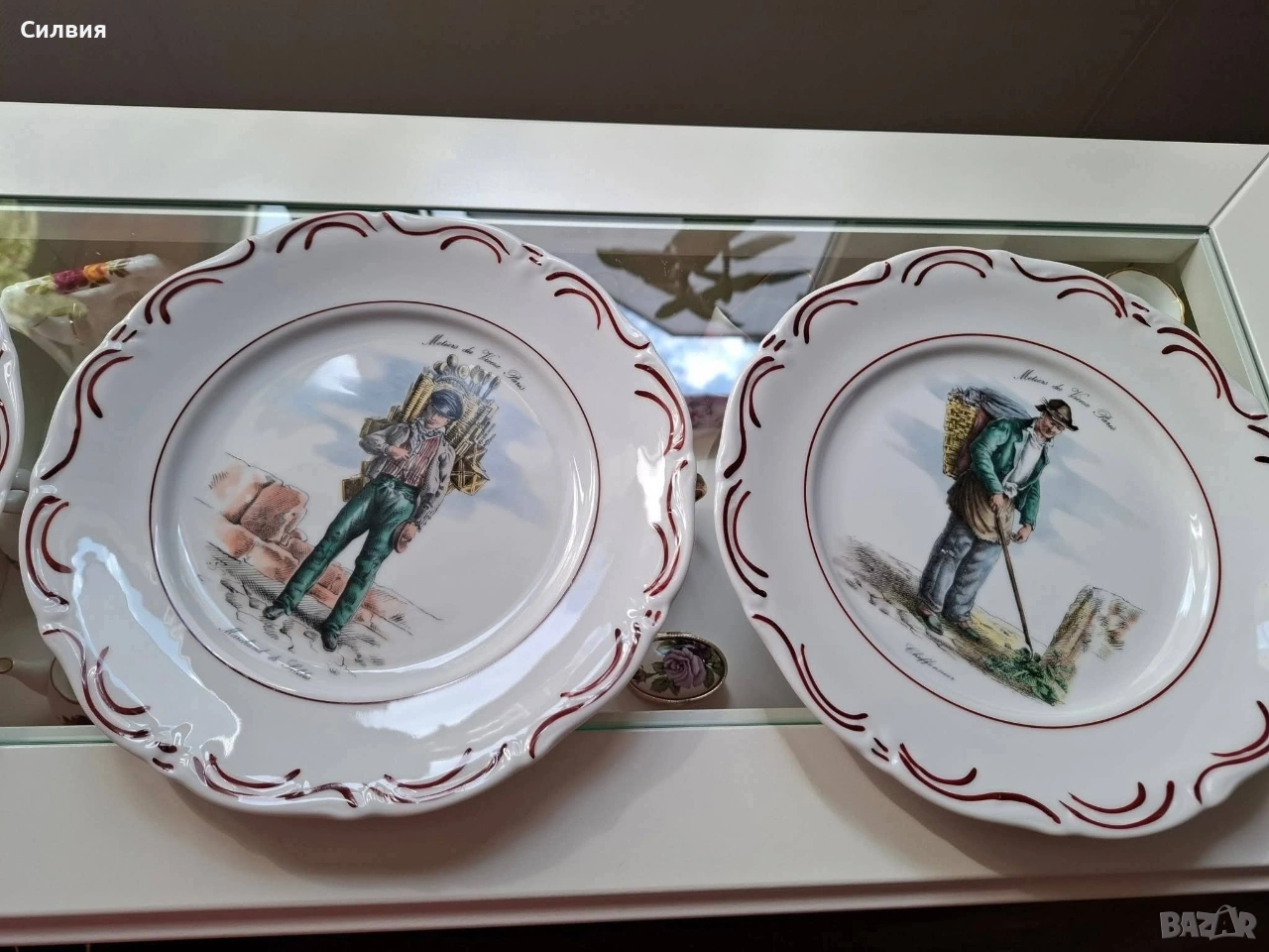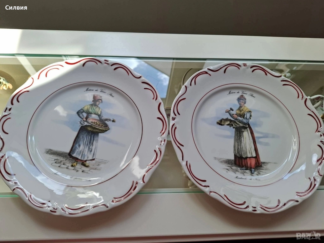 Винтидж комплект от 4 порцеланови чинии – Елегантна среща между изкуство и история. "Métiers du Vieux Paris" (Занаяти от стария Париж). Всяка чиния, с диаметър 24 см, е изработена от фин порцелан и украсена с релефен борд, обрамчен от изящен орнамент във виненочервен тон. Централните изображения пресъздават сцени от френски занаяти в Старата Франция – майстори и занаятчии, облечени в традиционни носии, уловени в моменти от своята ежедневна работа. Този комплект носи духа на отминали времена и излъчва топлината и романтиката на старинна Европа. Подходящ за декорация на стена, за колекционерска витрина или като изискан подарък за ценители на френската култура и винтидж изкуството. Тези чинии не са просто съдове, а малки произведения на изкуството, носещи духа на минали епохи и романтиката на старинна Европа. Подходящи за стилен интериор, колекционерска витрина или като изискан подарък за ценители на винтидж естетиката. Цена за 1брой 5️⃣5️⃣лв. 28,12 € ೋ🌷 ೋ🌷 ೋ🌷 Цена в комплект- 4броя- 1️⃣5️⃣0️⃣лв. 76,69 € Такива чинии са били популярни като сувенири или колекционерски предмети, представящи различни професии и сцени от ежедневието на Париж. Порцеланът "Стар Париж" е произвеждан през XVIII и началото на XIX век от различни парижки манифактури.