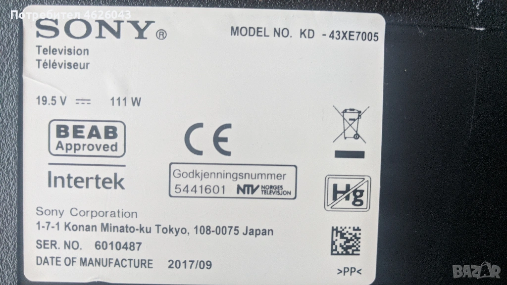 SONY KD-43XE7005-1-981-926-21-1-981-457-12-V17_43/49UHD_SONY T-CON_60Hz → Обява 53037664