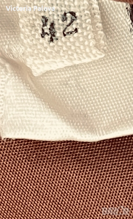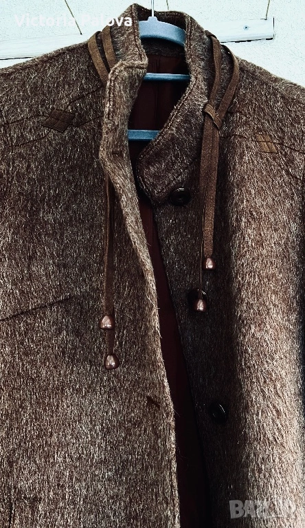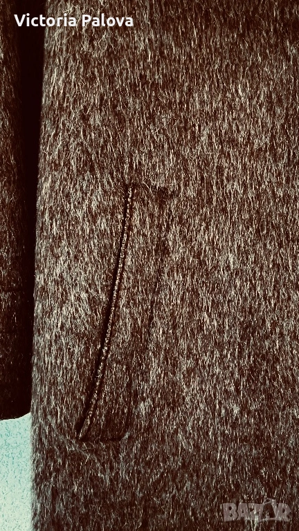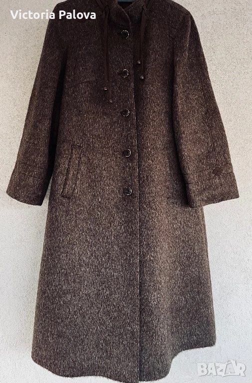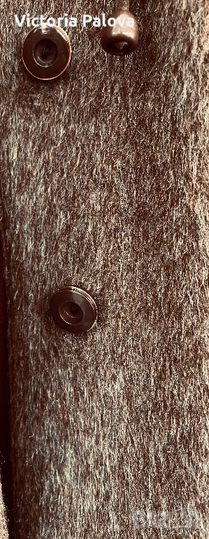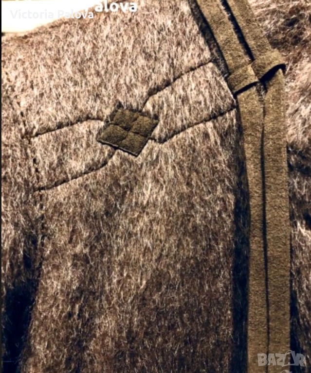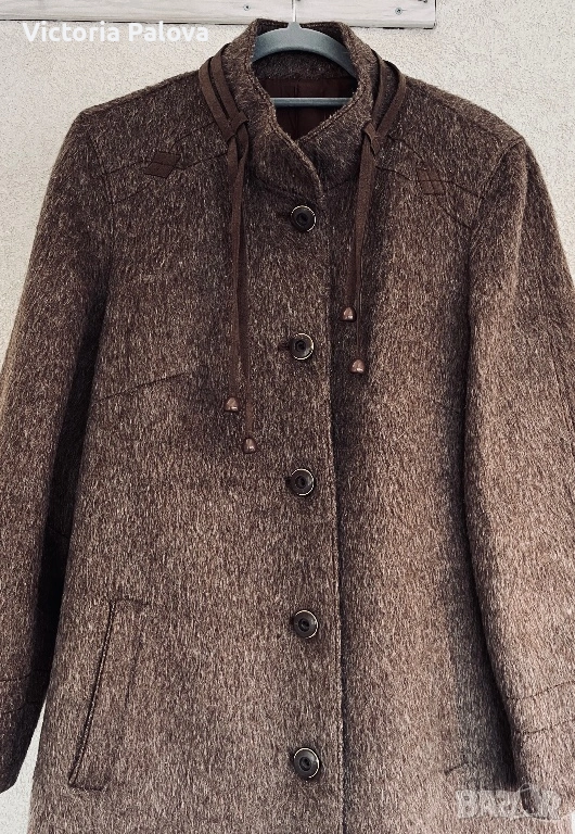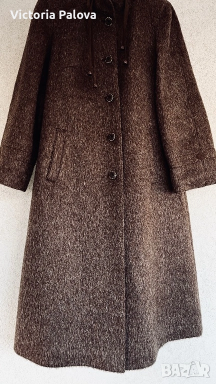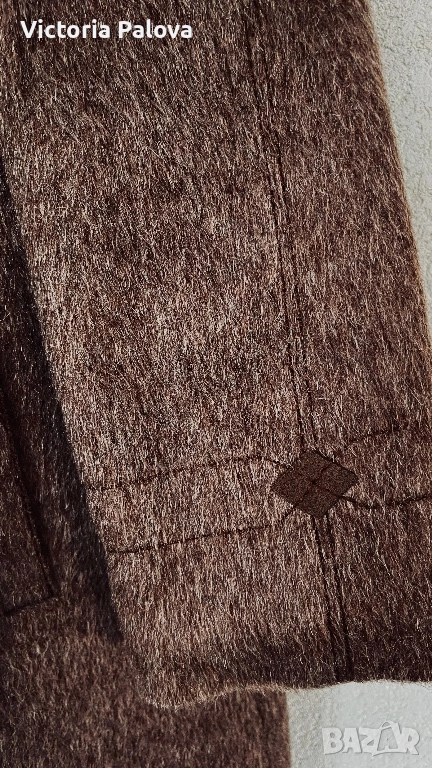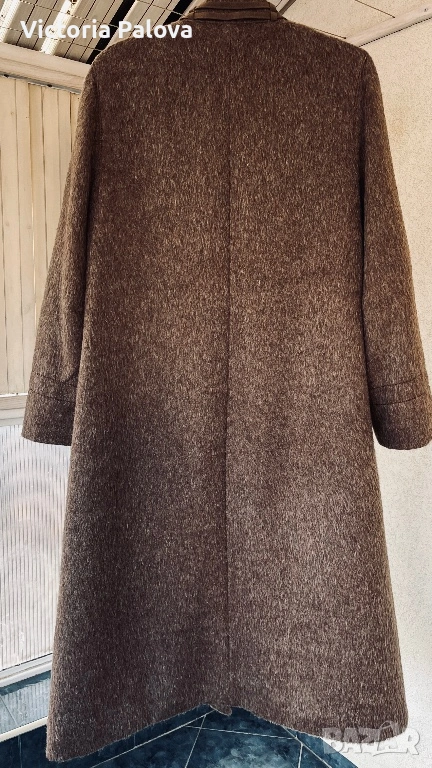 естествен косъм от лама с обозначение Llama Luxusqualität. Материята е жива и плътна, ясно изразена, а самият косъм е видим, натурален, с характерна структура, типична за лама, задържа топлината по естествен начин - палтото е леко при носене, но топли в пъти повече от стандартното вълнено палто, без да създава обем или тежест. Кройката е права и свободна, без вталяване. Палтото пада спокойно и стои комфортно по тялото. Закопчава се с красиви копчета, има два странични джоба и декоративни велурени връзки. Яката е мека и може да се носи както отворена, така и затворена. Цветът е кафяв с естествен меланж, подчертава структурата на косъма и изглежда актуално и елегантно. Рамо - 42см, ГО - 54см, ханш - 64см, дължина - 118см, ръкав - 60см.