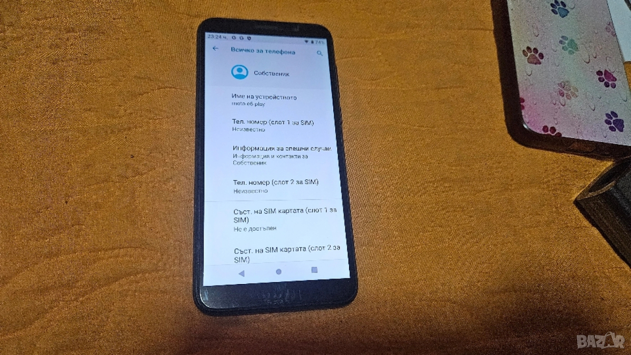 Motorola Moto E6 play Моторола. Много Добро външно състояние , непрекъснато е ползван със стъклен протектор и калъф. С възможност за ползване едновременно на две сим карти и карта памет. Оригиналното му зарядно и кабела са чисто нови, не са ползвани.