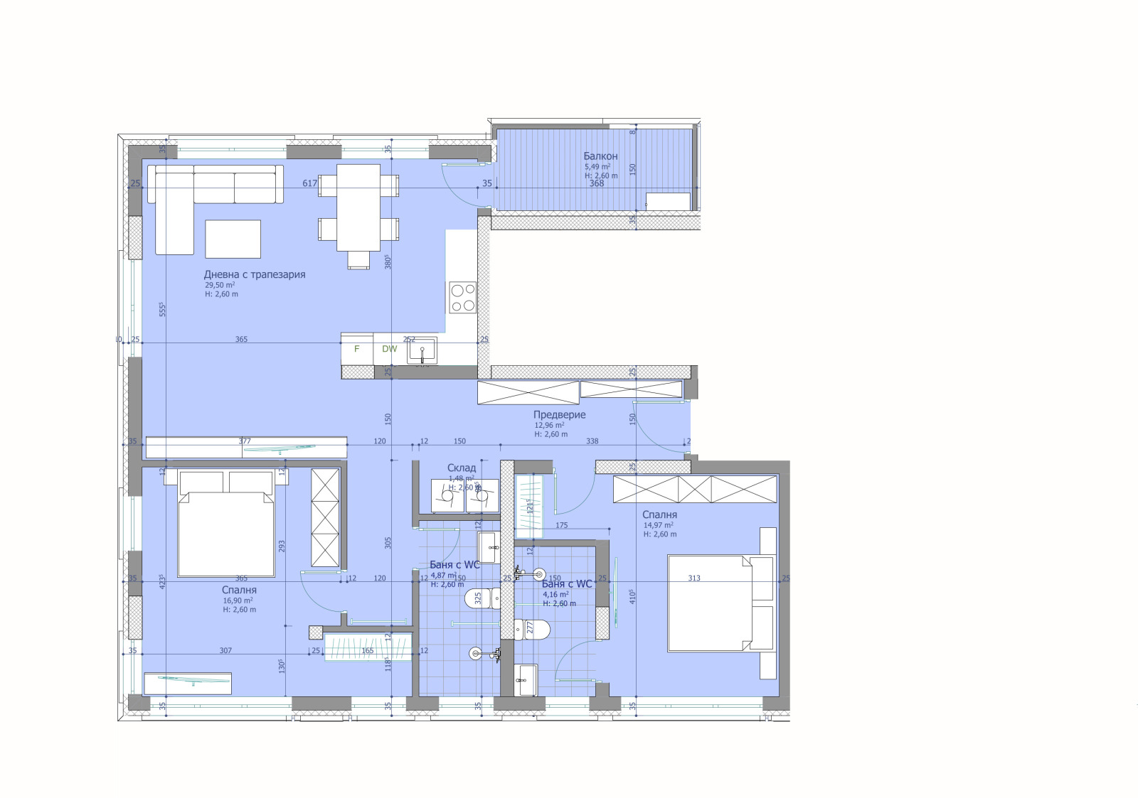 Апартамент разполага с голям хол, 2 спални, едната със собствена баня с тоалетна, втора баня с тоалетна и перално помещение, просторно антре, тераса, дом създаващ уют, спокойствие в условията на интензивна градска среда.