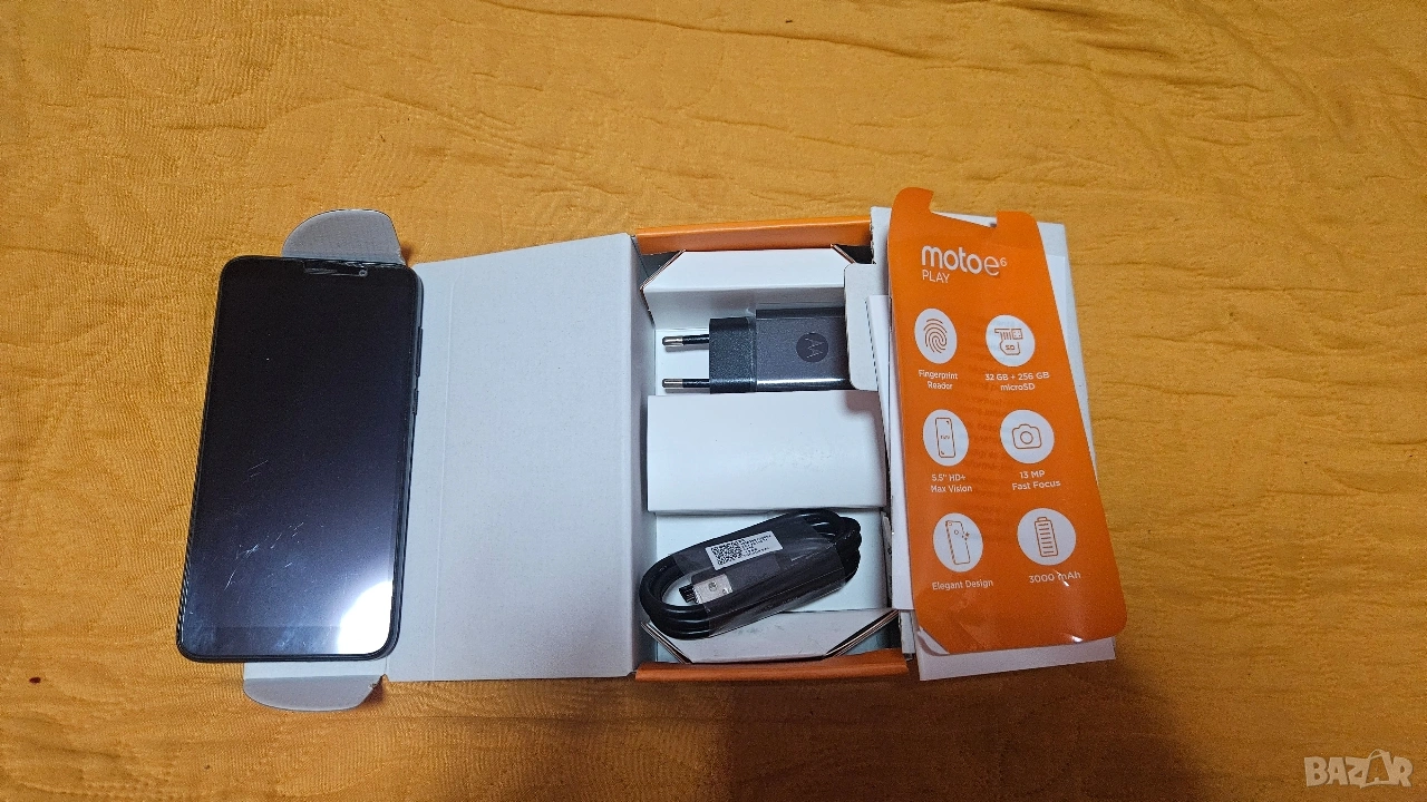 Motorola Moto E6 play Моторола. Много Добро външно състояние , непрекъснато е ползван със стъклен протектор и калъф. С възможност за ползване едновременно на две сим карти и карта памет. Оригиналното му зарядно и кабела са чисто нови, не са ползвани.