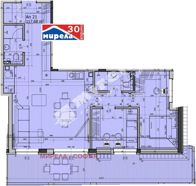Апартаментът има следното разпределение: антре, дневна с кухненски бокс, 2 спални, 2 бани с тоалетни и голяма тераса.