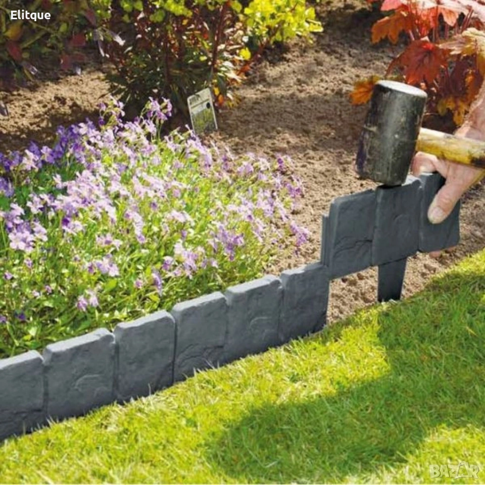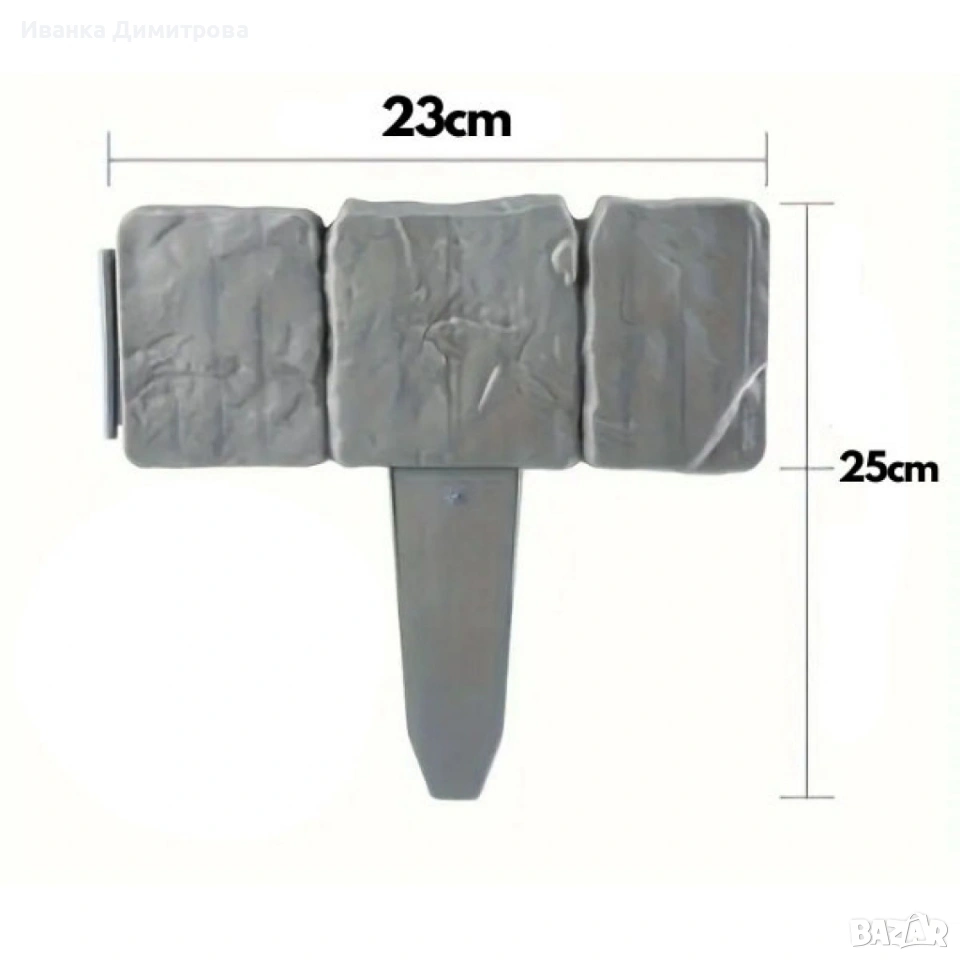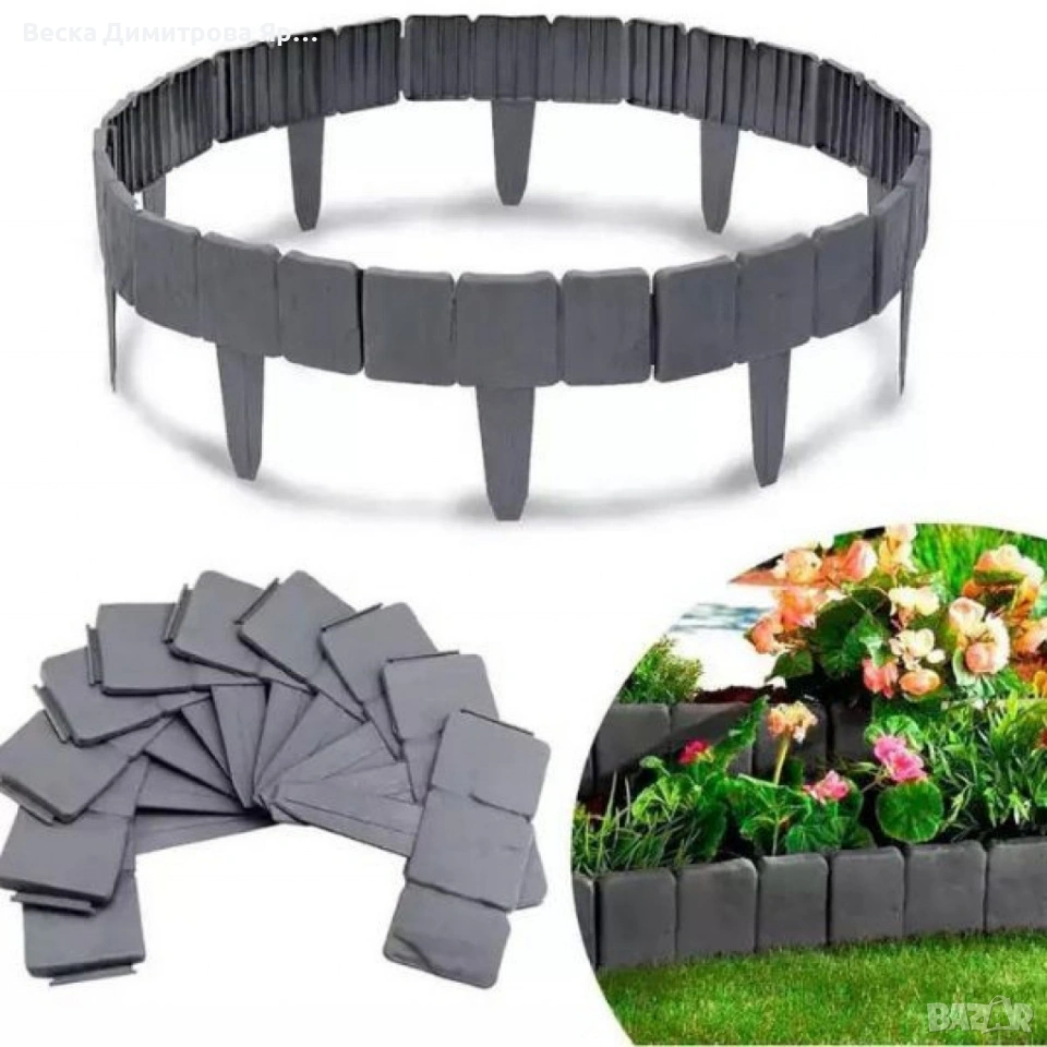 Продукт: Каменна градинска ограда / градински бордюр (комплект); Материал: PP пластмаса, устойчива на атмосферни влияния; Размер на елемент: 25 x 23 см; Цвят: сив; Брой в комплект: 10 броя; Обща дължина: приблизително 2,3 м; Монтаж: ръчен, чрез вграден кол, без нужда от инструменти; Приложение: разделяне на тревни площи, цветни лехи, алеи и декоративни зони.