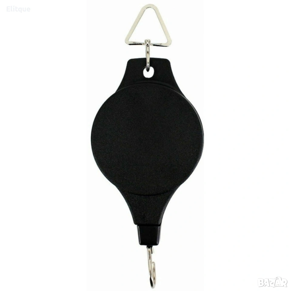Продукт: Телескопична градинска кука с прибираща се макара; Материал: пластмаса + желязо; Максимална дължина на въжето: около 1,6 м; Размери на корпуса: 18 x 8 x 2 см; Цвят: черен; Механизъм: автоматично фиксиране при издърпване; Приложение: висящи растения, саксии, хранилки за птици, декоративни елементи, лампи за растения; Подходяща за: вътрешна и външна употреба.