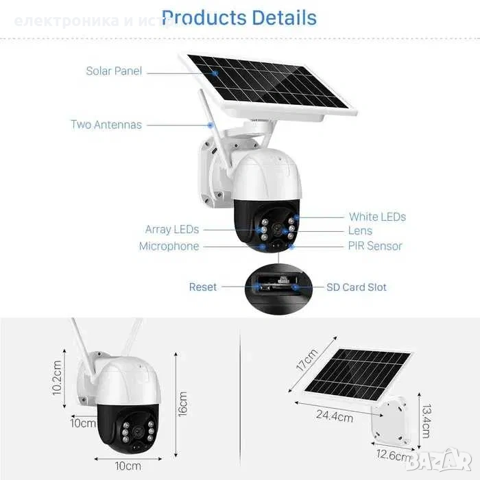 Соларния панел работи с 12000 mAH батерии тип 18360. IR диоди за нощно наблюдение до 30 метра и детайлна картина в дневен режим.