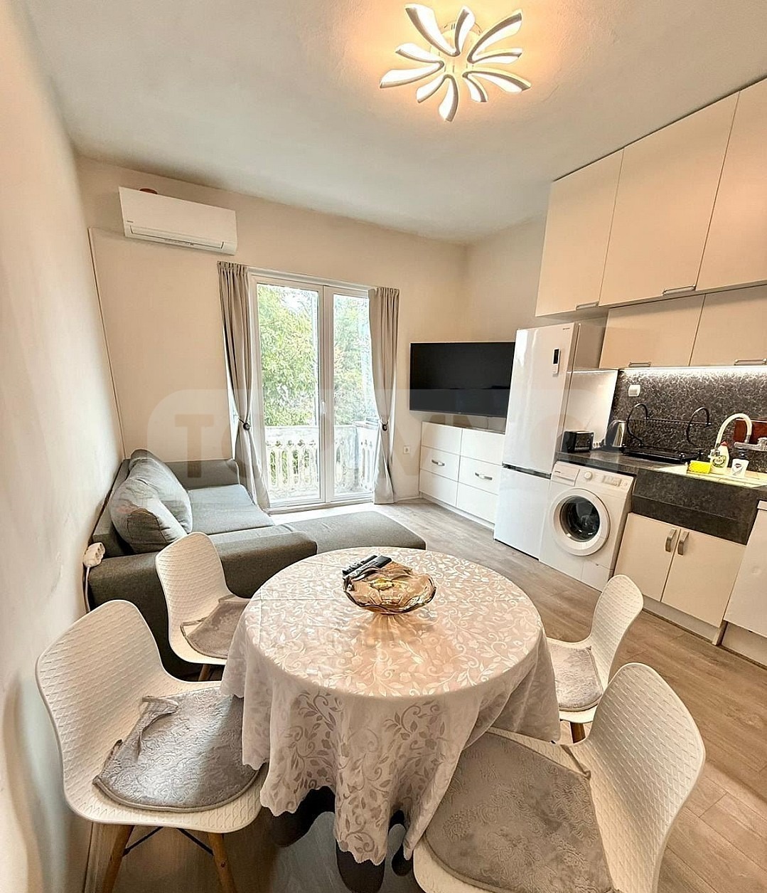 Апартаментът се намира на 1-ви жилищен етаж в четириетажна сграда. Състои се от дневна с кухненска част, 2 спални, баня с душ и вана, тоалетна с биде и тераса. Двете стаи са с телевизори 40,55 инча, третата с проектор 110 инча.