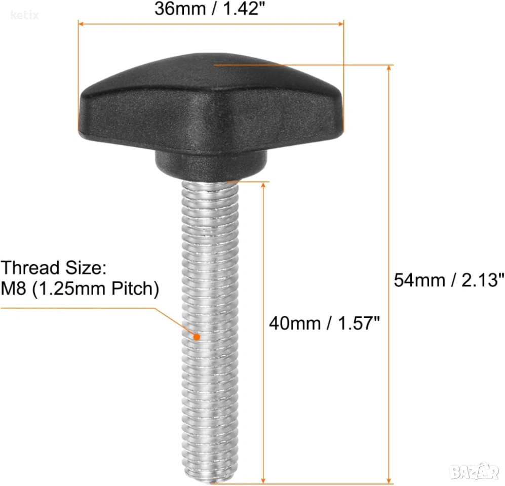 Размер - Стандартен размер на резбата: M8 (стъпка 1,25 мм); Дължина на резбата: 40 мм / 1,57"; Ширина на главата на Т-образния накрайник: 36 мм / 1,42"; Обща дължина: 54 мм / 2,13"; Стил на дръжката: Т-образна; Цвят: Черен (Резбата е чиста и прозрачна, силата е равномерна и дълбока, не се плъзга лесно и няма грапавини.)