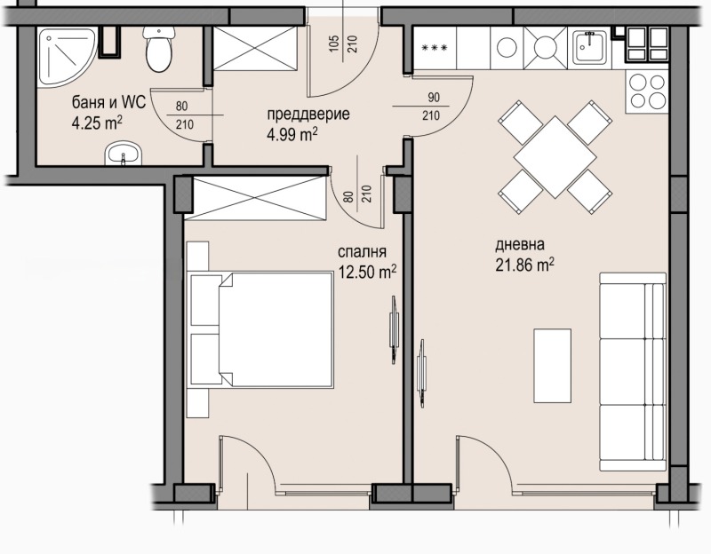 РАЗПРЕДЕЛЕНИЕ: Входно преддверие, просторна всекидневна с кухненски бокс, спалня и баня с тоалетна. Към апартамента има двор - 29м2.