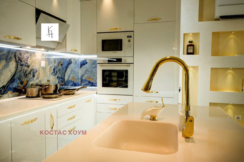 Кухня с остров- оборудван, BOSCH, вградена печка с фурна, микровълна ,ширм, миялна, пералня със сушилна , хладилник, кафе машина, чайник, климатик най висок клас,