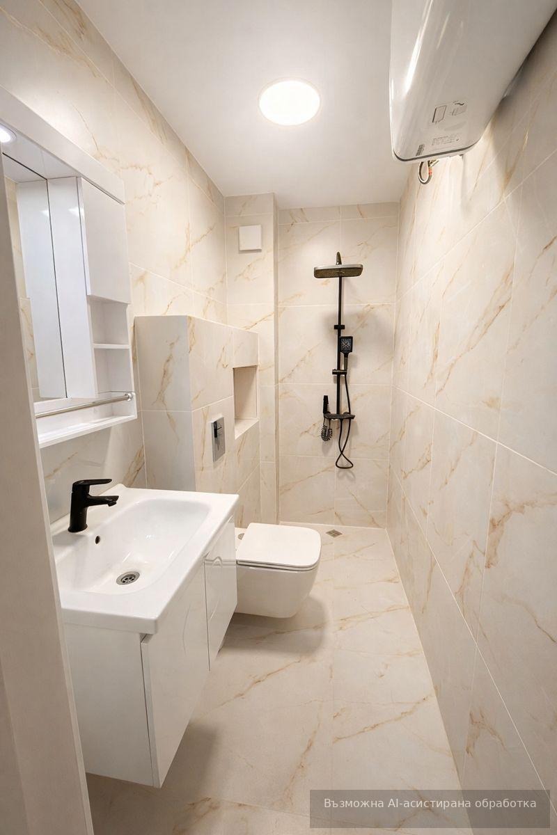 Имотът е ситуиран на 3-ти жилищен етаж и разполага с площ 58кв.м, разгърната в следното разпределение: входно антре, хол с кухненски бокс и трапезария, спалня, баня с тоалетна, перално помещение и тераса.