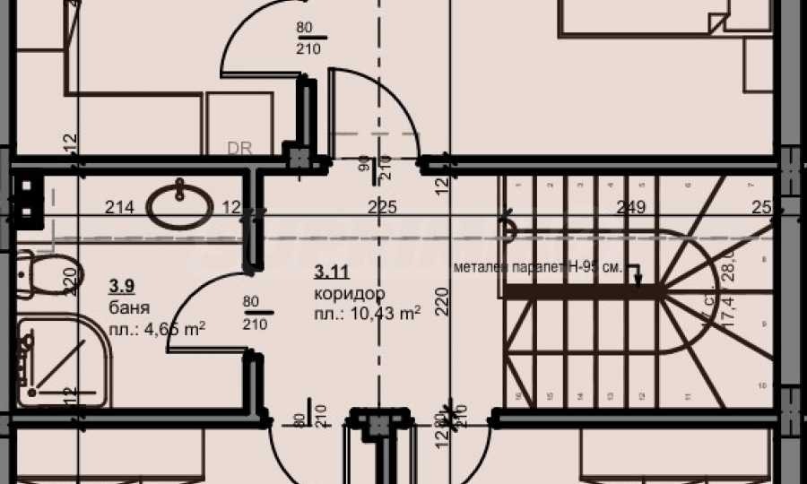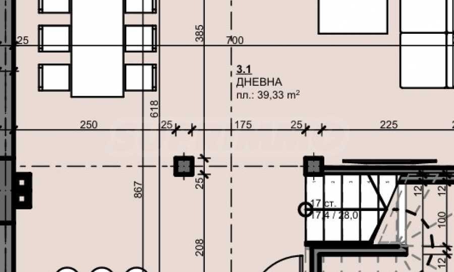 първи етаж - входно антре с тоалетна за гости и килер под стълбището, просторна дневна зона (около 40 кв.м) с отделен кухненски бокс (10 кв.м) и излаз към веранда и двор;