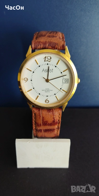 Елегантен позлатен часовник на германския бранд ASCOT. Красив и представителен. Почти без следи от употреба. Напълно запазена позлата, абсолютно чисти циферблат, стъкло, стрелки и маркери. Показва ден, час минута и секунди. Датата се сменя нормално. Механизмът е японски – MIYOTA и като всеки кварцов, работи много точно.