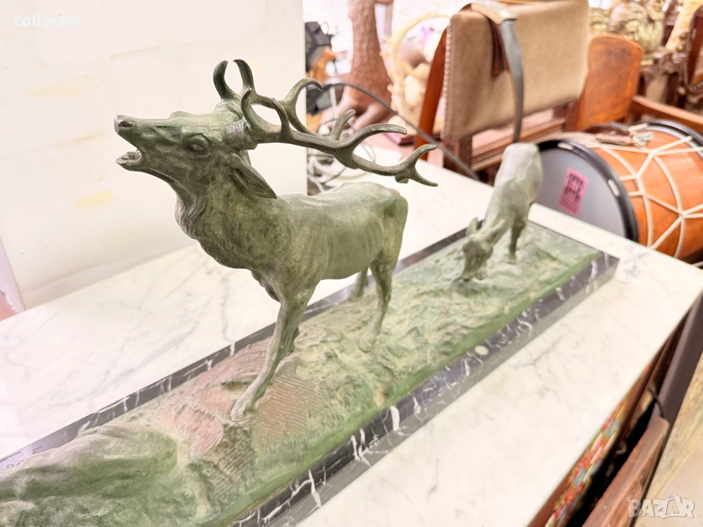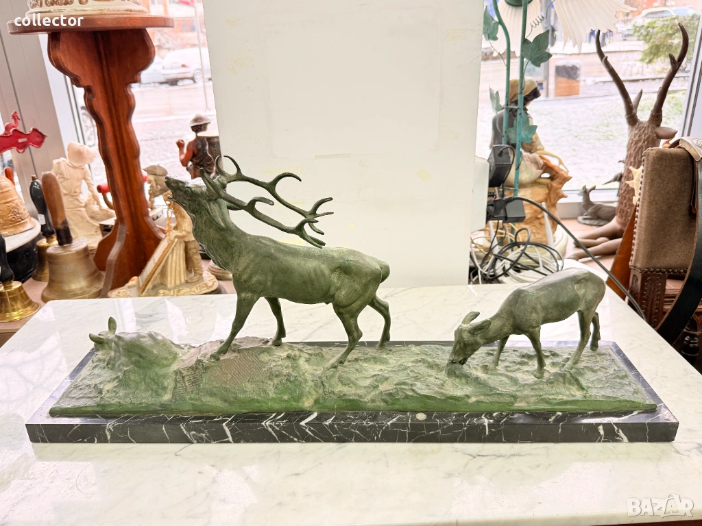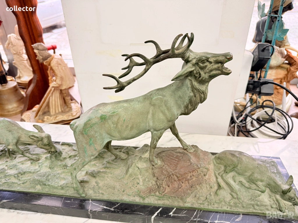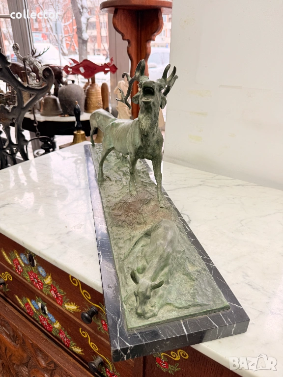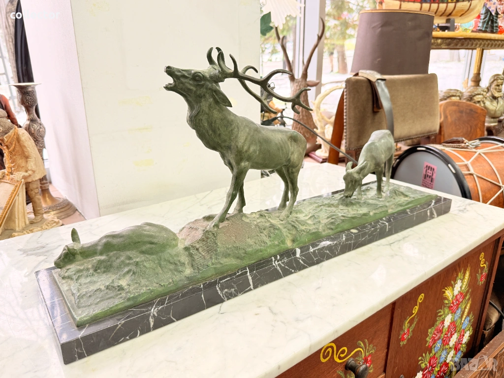 Патинирана бронзова композиция, изобразяваща сцена от дивата природа - Благороден елен с големи разклонени рога водещ две кошути. Фигурата е детайлна и динамична, поставена върху мраморна основа, която придава стабилност и представителен завършек.