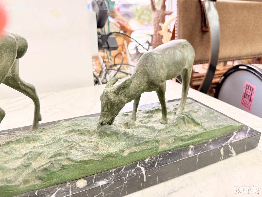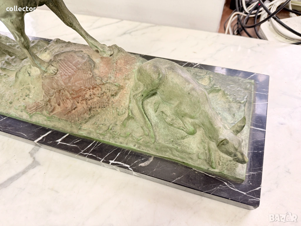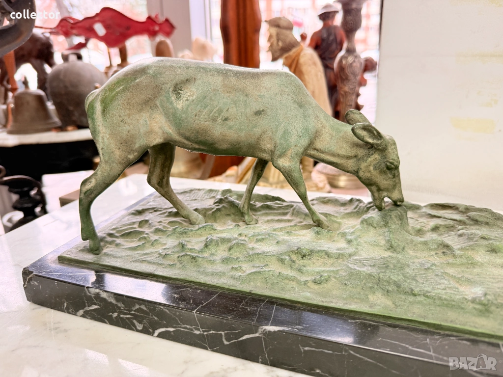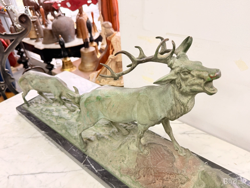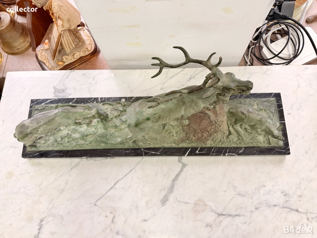 Патинирана бронзова композиция, изобразяваща сцена от дивата природа - Благороден елен с големи разклонени рога водещ две кошути. Фигурата е детайлна и динамична, поставена върху мраморна основа, която придава стабилност и представителен завършек.