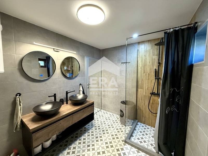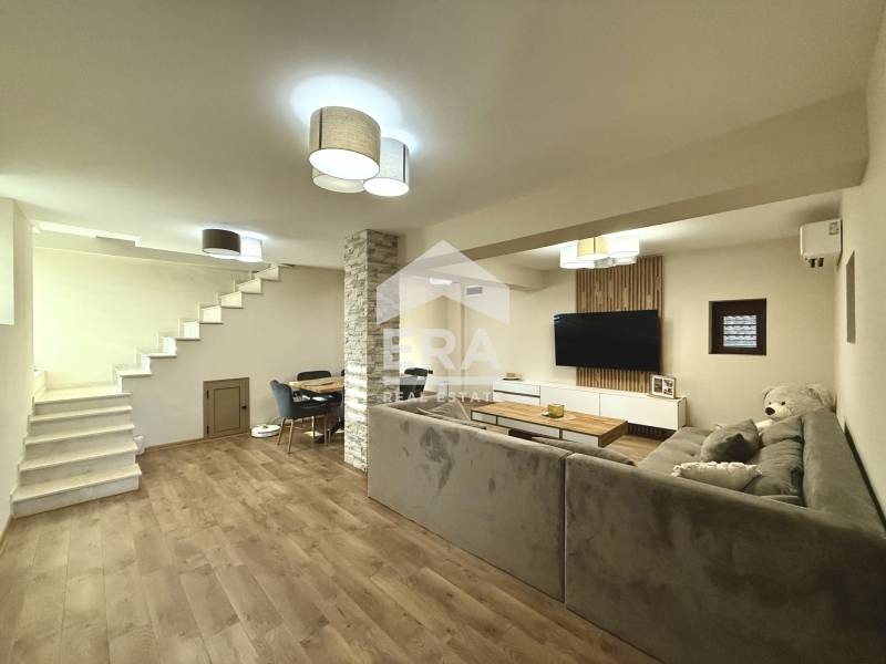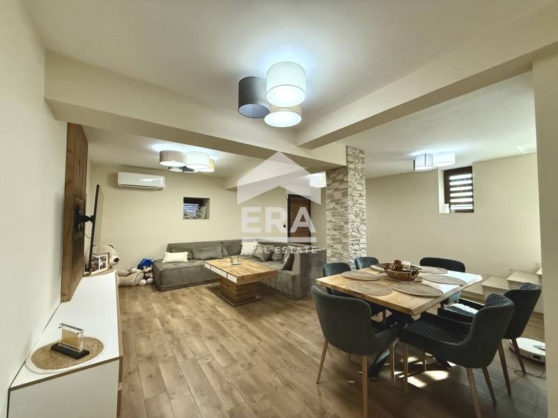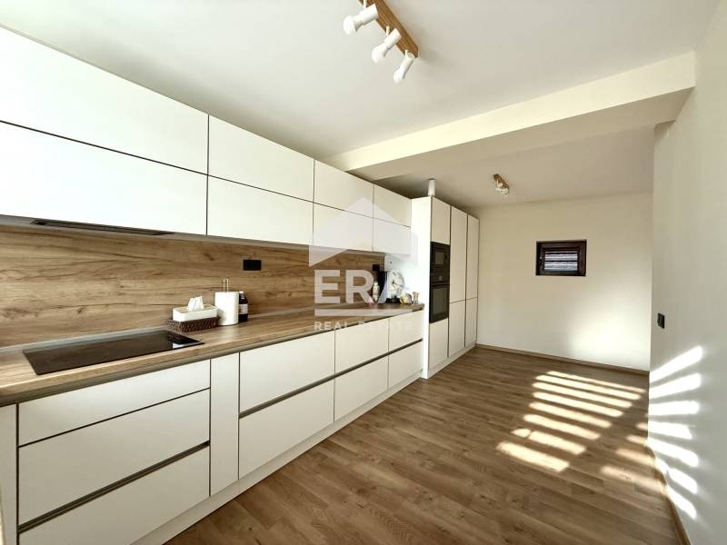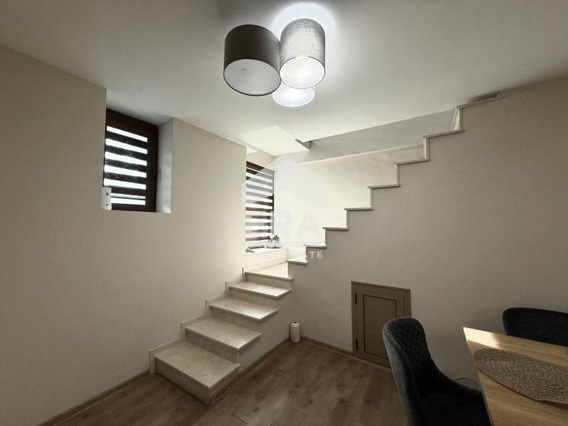 Имотът представлява напълно реновирана двуетажна къща с разгъната застроена площ от 170 кв.м., проектирана с внимание към детайла и изпълнена с висок клас материали. На първия етаж е разположено входно антре, което води към просторна дневна с трапезария идеално пространство за семейни събирания и посрещане на гости. На същото ниво се намират напълно оборудвана кухня и тоалетна. Достъпът до втория етаж е посредством вътрешно стълбище, където са разположени три спални, баня с тоалетна и тераса с приятна гледка към дворното пространство. Основната спалня разполага със собствена гардеробна, осигуряваща допълнителен комфорт и функционалност.