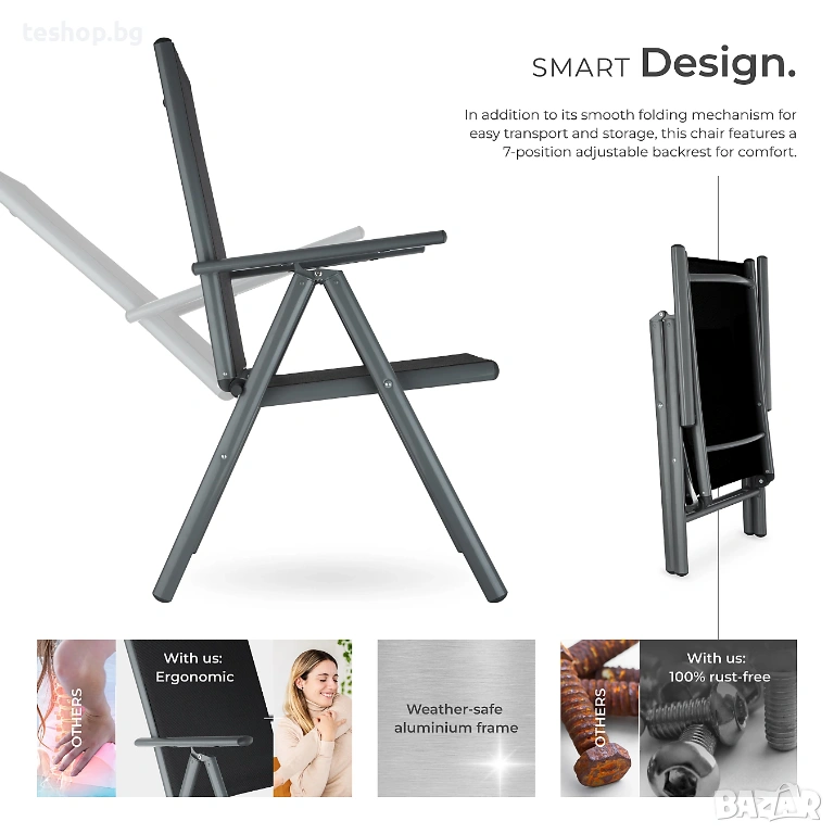 Градински столове Marilena сгъваеми, алуминиеви, облегалка с 7 позиции - антрацит - комплект от 4 броя Основна конструкция от покрит алуминий, изключително лека и устойчива