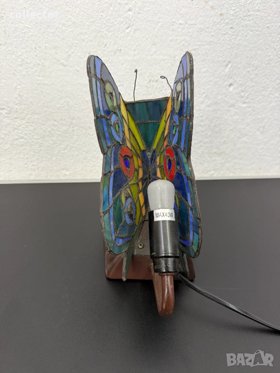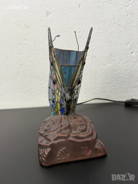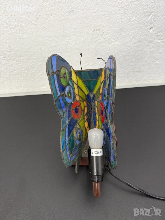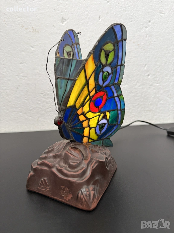 Настолна лампа Тифани, под формата на пеперуда. Абажурът на пеперудата е направен от множество ръчно изрязани парченца цветно стъкло (витраж), които са съединени с оловно-калаена спойка. Основата, върху която е поставена пеперудата, е изработена от смола (полирезин).