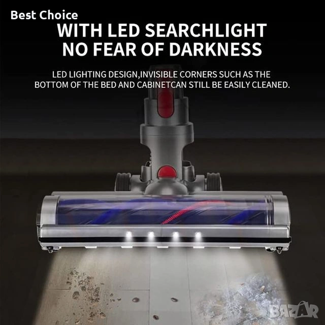 съвместима с електрическа четка за прахосмукачка Dyson V7, V8, V10, V11, V15 с директно задвижване с 4 предни светлини за твърди подове и килими с къс косъм. Турбинната дюза е забележителна за почистване на килими и плочки,