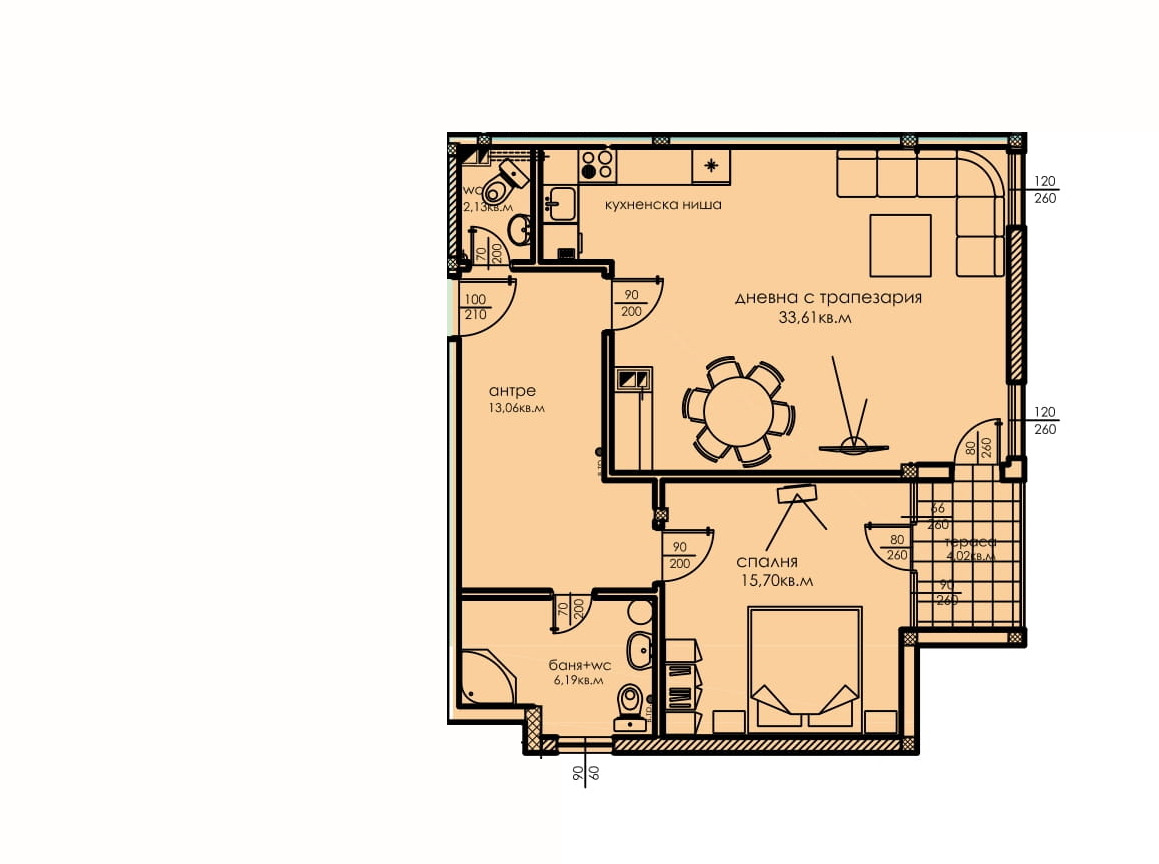 Голяма дневна в отворено пространство, организирана със зони кухня, хол, трапезария и излаз на тераса. Поръчкова кухня с пълно оборудване, стилно подбрано спрямо цялостния дизайн на пространството. Трапезария и хол с висок клас корпусна и мека мебел. Отопление и охлаждане с климатик.
