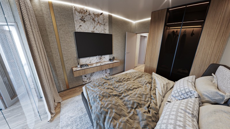 Частично завършен - Апартаментът е с напълно завършени бани и тоалетни, опънат таван, осветление и автоматични врати към лоджиите. (138 000 евро )