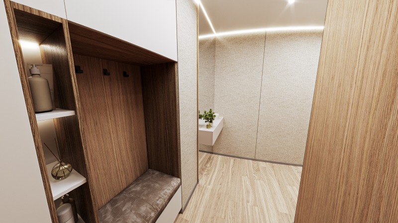 Подовата настилка е SPC покритие водонепропускливо, изключително устойчиво на надраскване, с визия 1:1 с естествен паркет и комфортно усещане при стъпване. Материалът е шумоизолиращ, топъл и лесен за поддръжка, с антибактериално покритие.