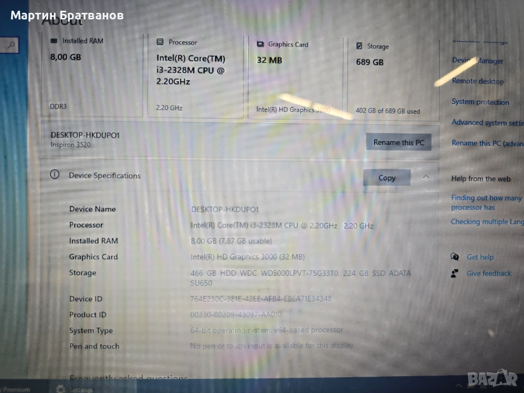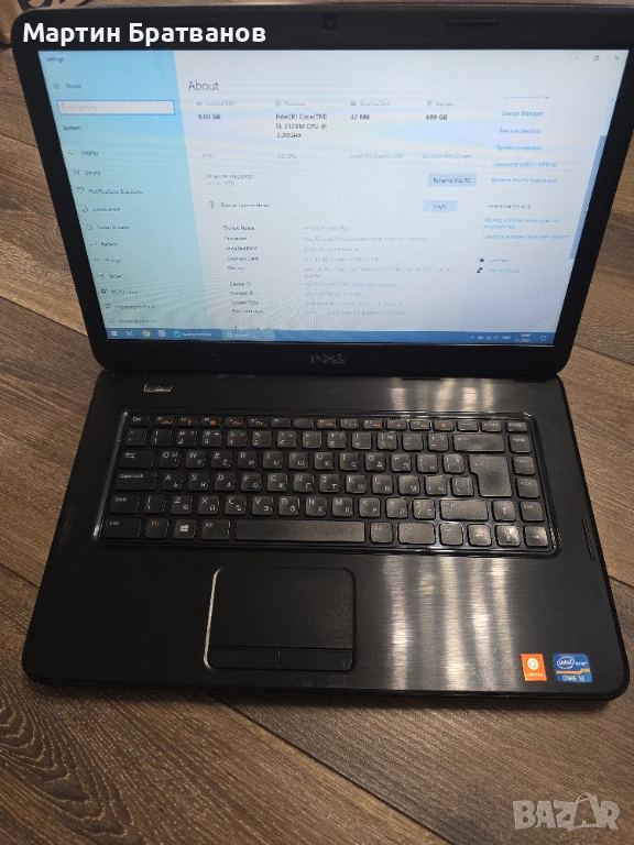 Лаптоп Dell Inspiron 3520, Intel i3-2328, 8GB RAM, SSD, Windows 10 → Обява 53044277