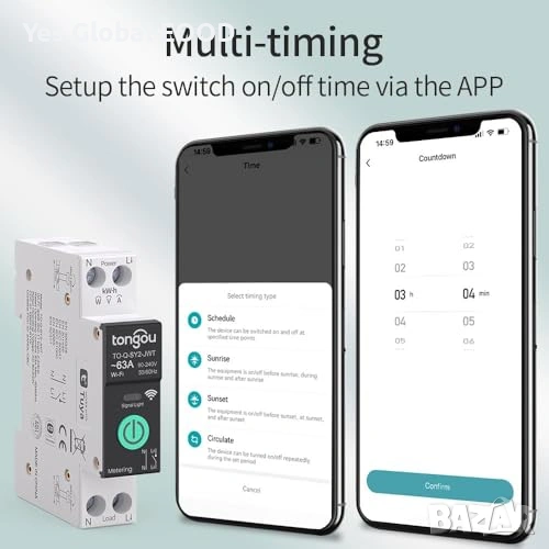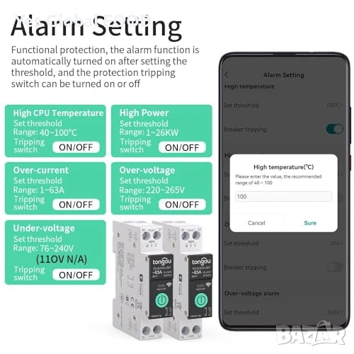 Интелигентният прекъсвач TONGOU Smart Switch 1–63A е предназначен за защита и управление на електрически вериги в домашни и професионални инсталации. Монтира се на DIN рейка и позволява дистанционно управление и мониторинг чрез приложението Smart Life / Tuya. Поддържа гласово управление чрез Alexa и Google Assistant. Регулируемият ток и множеството защитни функции осигуряват надеждна и безопасна работа.