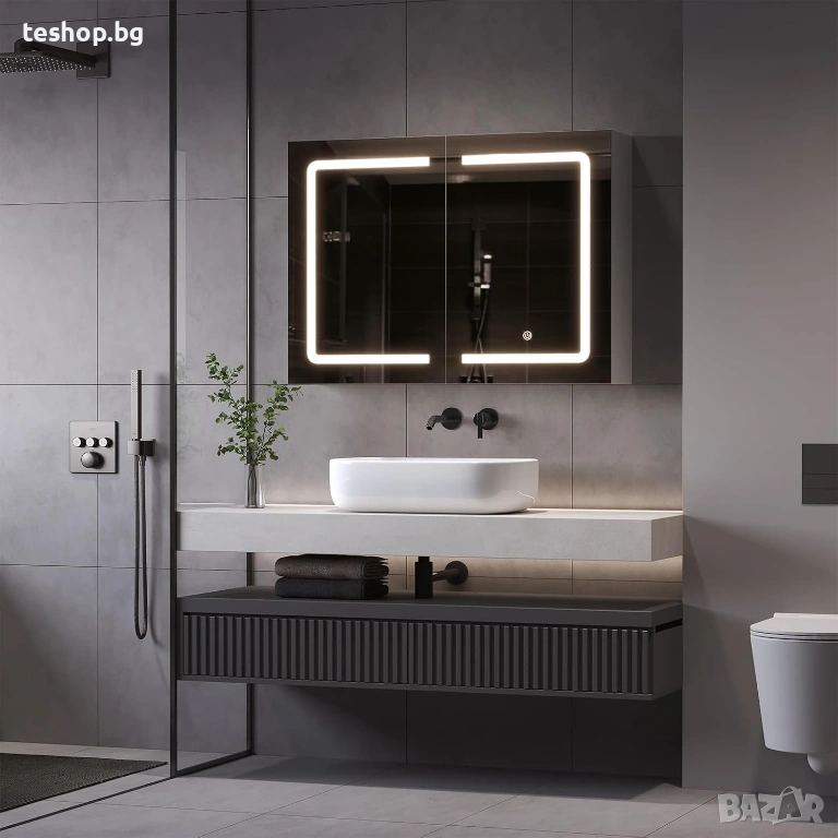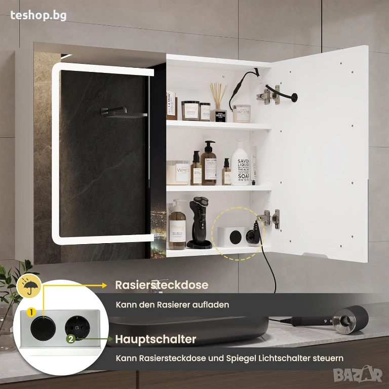 С контакт: Долната дясна част на вътрешността на огледалния шкаф е практична комбинация от ключ за осветление и контакт. Тя не само предотвратява навлизането на вода в контакта, но е и удобна за зареждане на самобръсначка или използване на сешоар. Ключът в шкафа е основният контролен ключ, който управлява захранването на огледалния шкаф за баня. Ако не използвате контакта, можете да го изключите от съображения за безопасност.