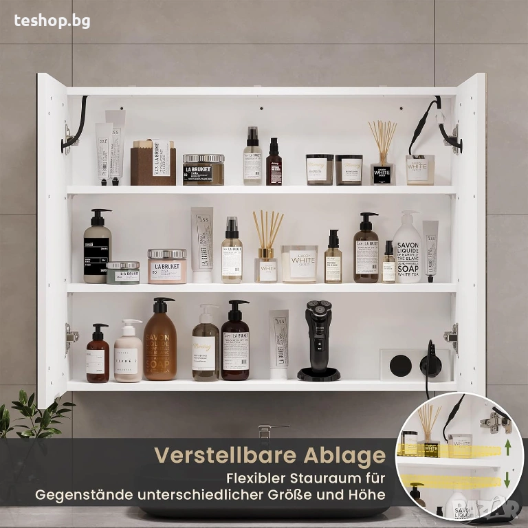 Практично пространство и голям товар: Огледален шкаф с двойна врата DICTAC предлага голямо място за съхранение. Зад вратата има 2 регулируеми рафта. Има три нива за поставяне на предмети с различна височина. В неговия просторен интериор могат да се съхраняват подредено бръсначи, лични продукти за грижа, четки за зъби, козметика или други предмети. Скритият дизайн предотвратява навлизането на прах и защитава вашата поверителност. Всеки рафт може да носи товар до 10 кг.
