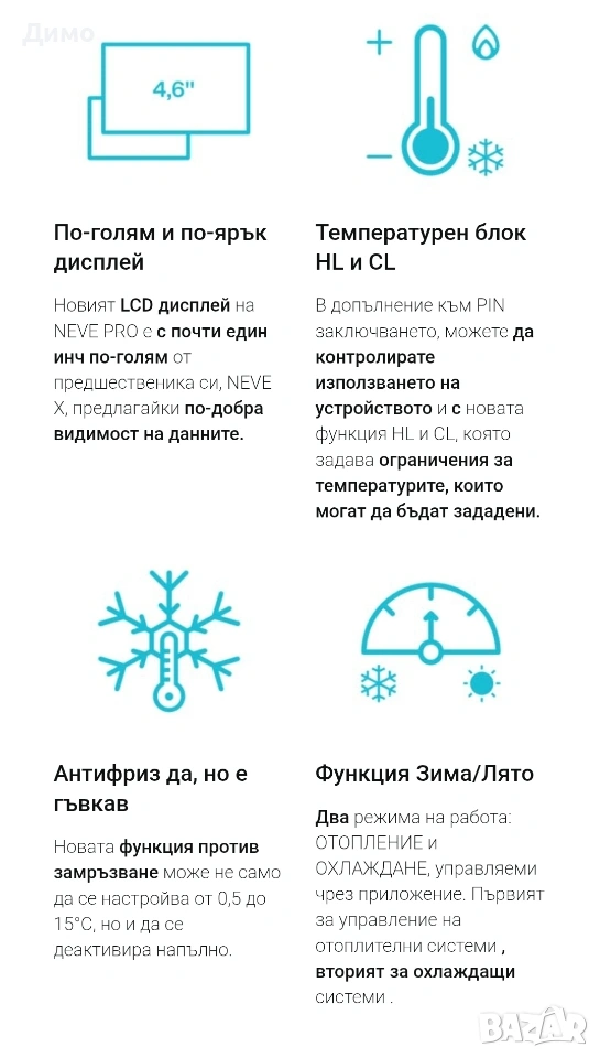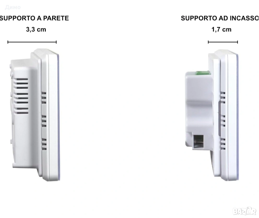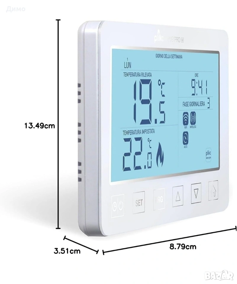 ДВУЛАНТОВЕН, РАБОТИ С ВСИЧКИ WIFI МРЕЖИ, както 2.4GHz, така и 5GHz. Съвместим с ALEXA и GOOGLE ASSISTANT. УПРАВЛЯВА СЕ ОТ НЯКОЛКО СМАРТФОНА и множество потребители едновременно. Специализирано и ВИНАГИ БЕЗПЛАТНО ПРИЛОЖЕНИЕ, както за iOS (iOS 10.0 и по-нови версии), така и за Android (4.0.3 и по-нови версии), което може да се изтегли безплатно от съответните магазини за приложения. Безжична цифрова (WIRELESS) и WIFI връзка, състояща се от две устройства, и двете за инсталиране в кутия 503, приемник, захранван с 220V, и предавател, захранван с батерии (2 x 1.5 AA батерии) или чрез MICRO USB кабел (не е включен), ако се постави на основата на масата. Управлявайте всичко от всяко място с WIFI, но благодарение на WIRELESS, т.е. безжичната радиочестотна комуникация между приемника и хронотермостата, намирате решение на много проблеми, свързани с монтажа. ИЗВЕСТИЯ ЗА СМАРТФОН, ако желаете, за всяка промяна, направена на термостата, или когато температурните условия в помещението, в което е инсталиран термостатът, се променят. ГРАФИКА НА ЗАСЕДНАТИТЕ ТЕМПЕРАТУРИ и общите часове работа на котела. Напълно програмируема и управляема от вашия смартфон чрез приложението. ЗАДАВАНЕ НА ТЕМПЕРАТУРАТА С ИЗКЛЮЧИТЕЛНА ПРЕЦИЗНОСТ на стъпки от 0,1°C. Освен това можете да калибрирате ТЕРМИЧНАТА ДИФЕРЕНЦИЯ (ХИСТЕРЕЗИС) от 0,2 до 2,0°C, както и СОНДАТА ЗА ДЕТЕКТИРАНЕ от -3° до +3°, за да адаптирате хронотермостата към вашата среда и да го настроите с други устройства във вашия дом. ДИСТАНЦИОННО ЗАКЛЮЧВАНЕ С ПИН КОД с две нива на сигурност: бутоните на термостата могат да бъдат заключени напълно или частично, което позволява само повишаване и понижаване на температурата или включване и изключване на устройството. Освен това, може да се зададе МАКСИМАЛНА И МИНИМАЛНА ТЕМПЕРАТУРА, за да се ограничи температурният диапазон, който може да бъде избран от устройството. ДО 8 ФАЗИ на ден с опция за елиминиране на ненужните. Функция ЛЯТО/ЗИМА за работа както с охлаждащи, така и с отоплителни системи. А ако не искате да го програмирате или да използвате смартфона си, можете да го ВКЛЮЧВАТЕ и ИЗКЛЮЧВАТЕ с един бутон, като традиционен термостат. Освен това има 3 ръчни режима: „постоянен“, „временен“ и „почасов (ТАЙМЕР)“, като оставащото време се показва както на дисплея, така и на вашия смартфон. Съвместим е и със SmartLife, TuyaSmart, HomCloud и други приложения на Tuya. Възможност за създаване на СЦЕНАРИИ, АВТОМАТИЗАЦИИ и РУТИНИ директно от приложението. Технология GEOFENCING за програмиране въз основа на местоположението и дистанционно управление: програмируемият термостат ще включва и изключва системата въз основа на местоположението на смартфона, сдвоен с него. ДЕАКТИВИРАН и/или РЕГУЛИРУЕМ режим ПРОТИВ ЗАМРЪЗВАНЕ от 0,5°C до 15°C. Новата функция „Против замръзване“ може не само да се регулира, но и да се деактивира напълно. Това защитава вашата система, но в някои специфични случаи предотвратява нежелани стартирания.