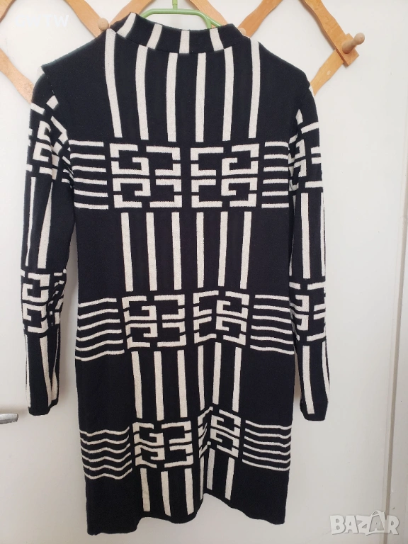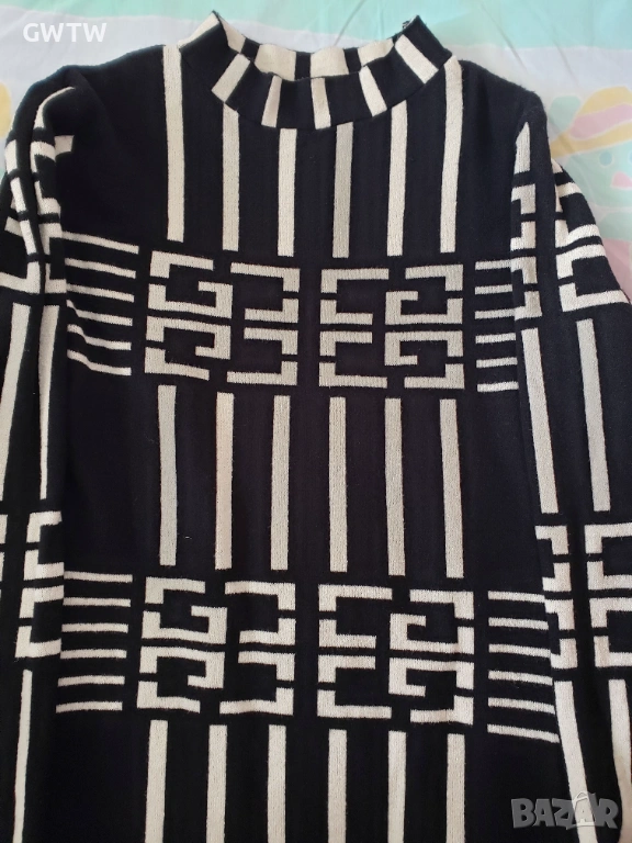 Зимна италианска рокля от плътно трико. Цветът е черен с бежаво. Стои по тялото. Материята е много мека и топла, има разтегливост. Дължина от рамото 77см. Роклята е без забележки, в отлично състояние. Стилна и удобна за носене през студените месеци.