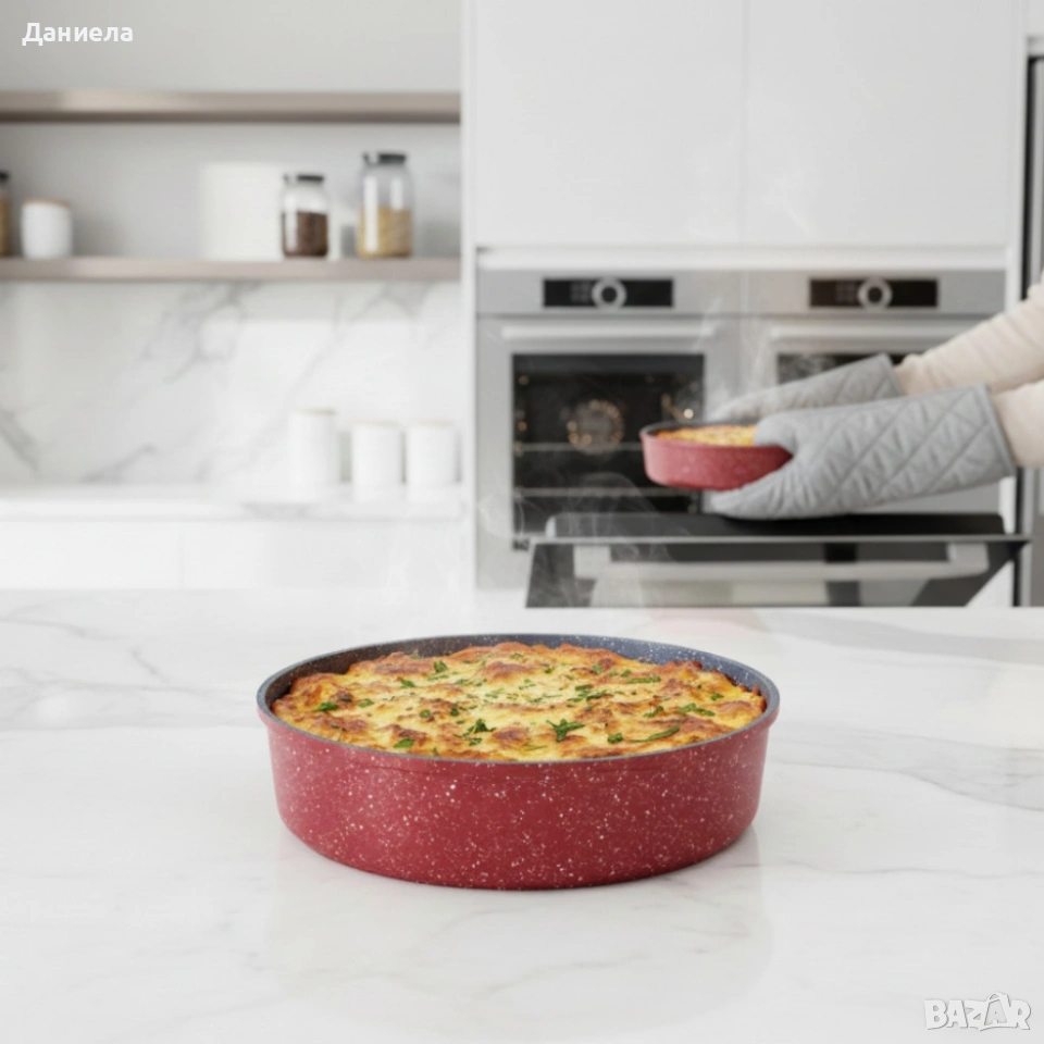 Материал: лят алуминий; Покритие: керамично-мраморно, незалепващо, безопасно за храна; Размери / вместимост: Ø28 см / Ø30 см / Ø32 см, височина 7 см; Температурна устойчивост: подходяща за котлон и фурна; Дебелина / здравина: стабилна конструкция за ежедневна употреба; Поддръжка / почистване: подходяща за съдомиялна машина; Сертификации / безопасност на храните: покритие без вредни вещества; Употреба / домашна употреба. Размер: 28см: 22.00€ Размер: 30см: 25.00€ Размер: 32см: 26.00€