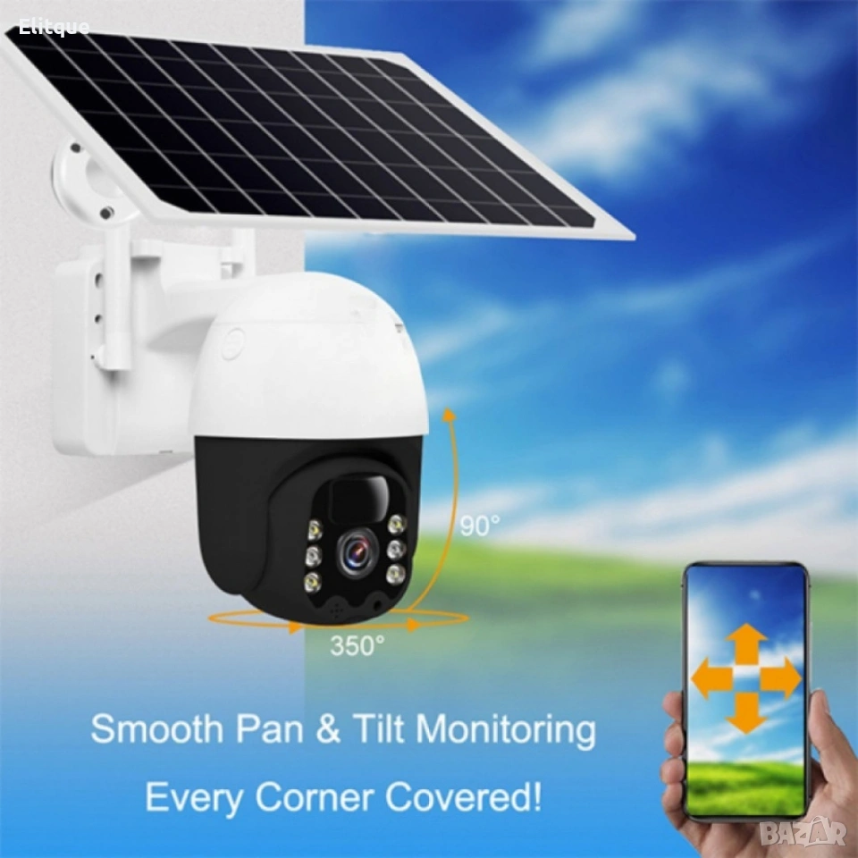 Резолюция: 3MP (2048 x 1536); Захранване: Соларен панел 8W и батерия 8000mAh (включена в комплекта); Вид сензор: PIR сензор; PTZ обхват: Хоризонтален 355°, вертикален 100°; Ъгъл на обектива: 95°; Обхват на засичане: 0–12 метра; Нощно виждане: Цветно; Съхранение: TF карта до 64GB (не е включена); Работна среда: От -30°C до +60°C; Защита: IP66 – устойчива на влага и прах; Размери: 170 x 210 x 165 мм. Камерата е на Wi-Fi, не е на 4G