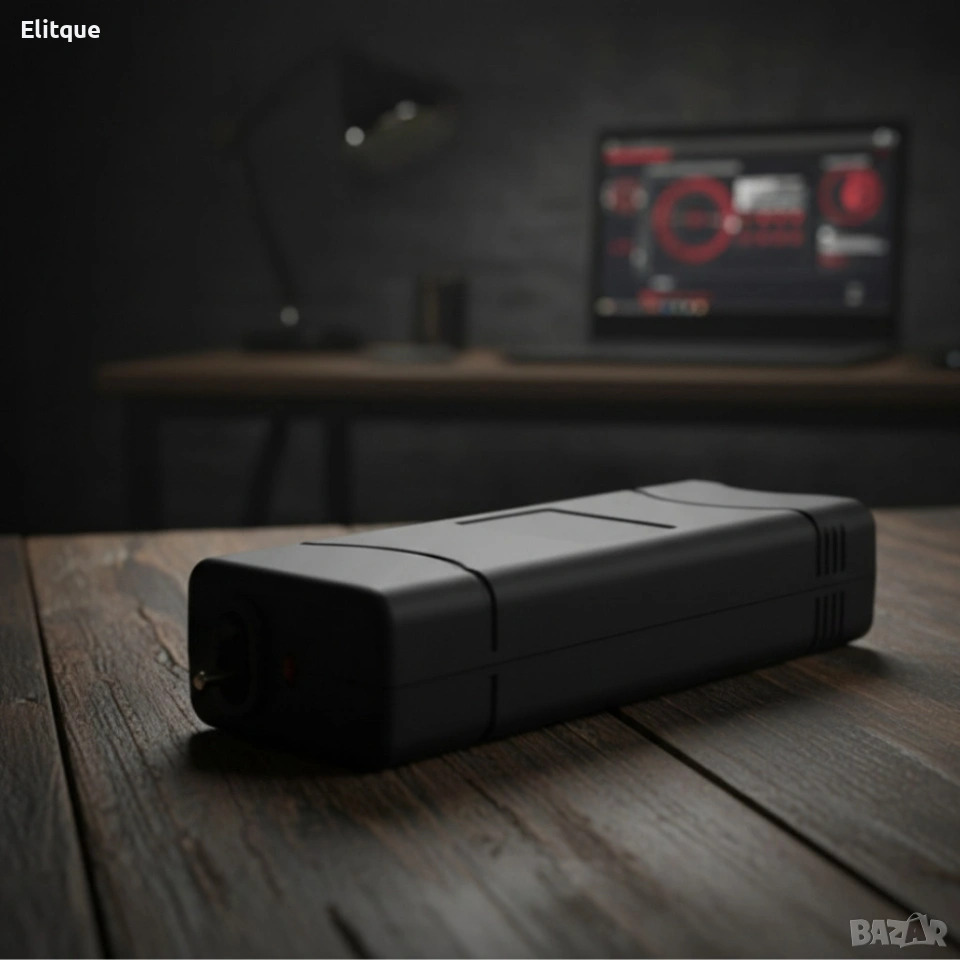 Продукт: Устройство за самозащита - електрошок и LED фенер; Напрежение на разреждане: до 5000K волта; Допълнителни функции: Вграден LED фенер с висока интензивност; Предпазен механизъм: Да; Захранване: Вградена презареждаема акумулаторна батерия (1 бр., включена в устройството, не са необходими отделни батерии); Материал / корпус: Удароустойчива пластмаса, матово черно покритие; Размери: 10.5 x 5.2 x 2.2 см; Цвят: Черен.